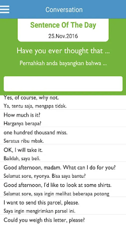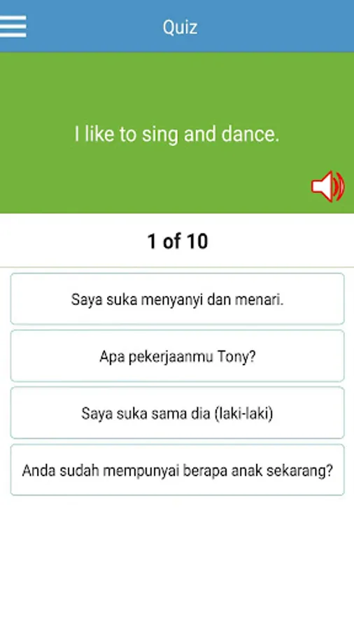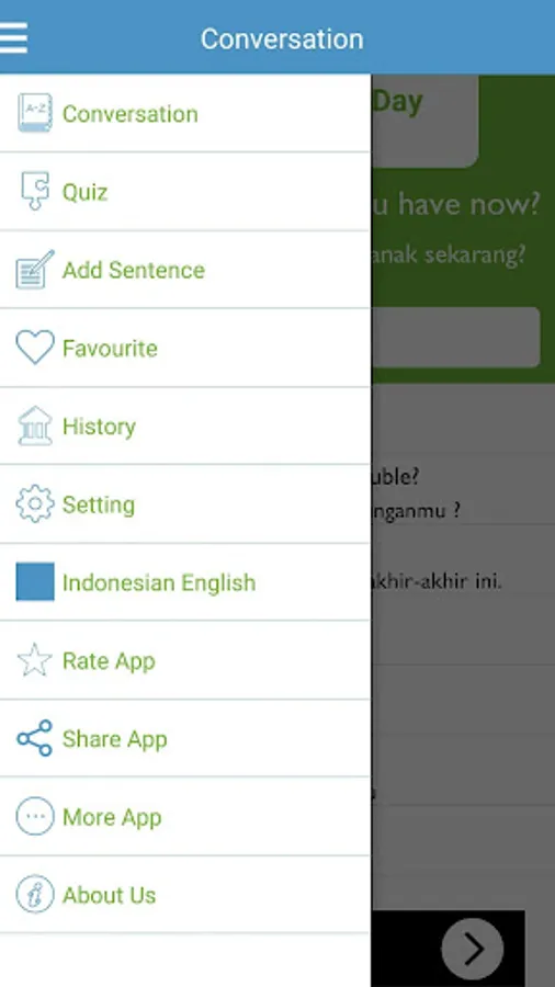 Learn to master English to Indonesian with this educative application. It contains a lot of daily conversation example for different situation & you can add more sentences to enrich your learning journey as application is featured with Text to speech, Recording & Play back, Quiz and other features.