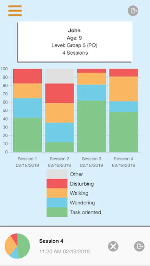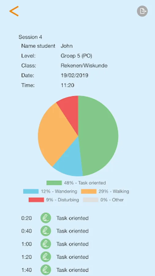 With the help of the Tijdsteekproef, a behaviour observation tool, teachers, school counselors and other educational professionals are able to measure the task orientation of his or her students, in both primary and secondary education. The measurement will take 20 minutes; every 20 seconds there will appear 5 options on your screen (task oriented, wandering, walking, disturbing and other). You select one; describing the student’s behaviour at that exact moment. The observation will be stopped right after the 20 minutes have passed. Next, you will get the results of your observation as a circular histogram with percentages. In case you are not able to observe a student for the full 20 minutes, you can always pause the measurement and decide to stop the observation or continue a few minutes later. Finally you will be able to send yourself the results in a well structured report by email.
