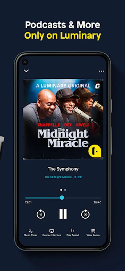 • Let Luminary and your favorite podcast lull you to sleep. Set a sleep timer for 10 minutes, 30 minutes, 1 hour, or the end of your current episode.