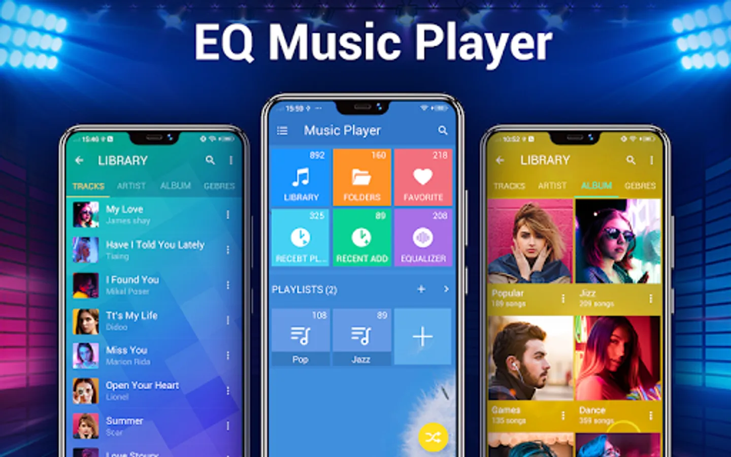 Powerful equalizer, Quick search all music and audio files, Easy to support all music & audio file formats, Custom background skin.