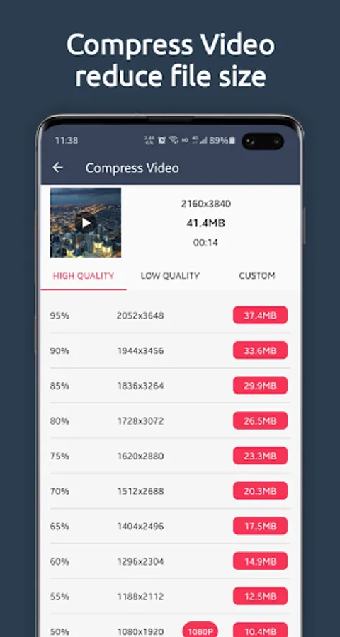 Compresses video files and reduce video size, shrink video, save your device's storage space. Compressing a video makes it much easier to share on social networks such as facebook , instagram, tiktok.