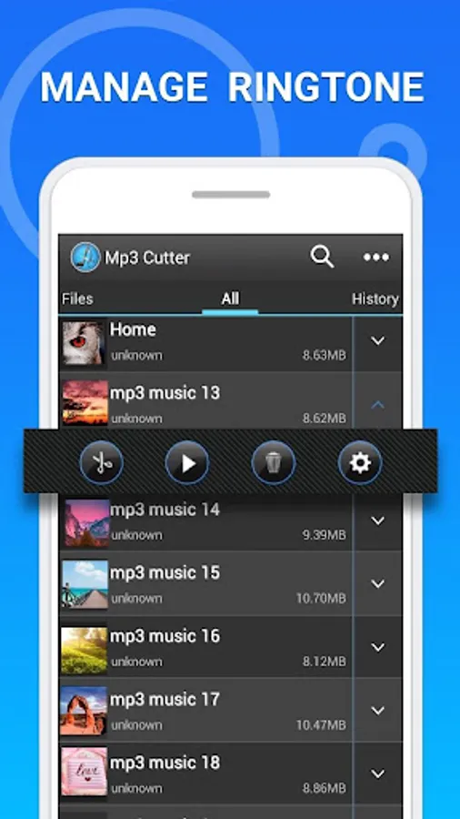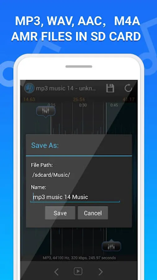MP3 Cutter is a powerful music tools for editing MP3, WAV, AAC, and AMR audio files. MP3 Cutter Support merging of audio files. MP3 Cutter Cut the best part of your music and save it as your Ringtone/Alarm/Music/Notification.