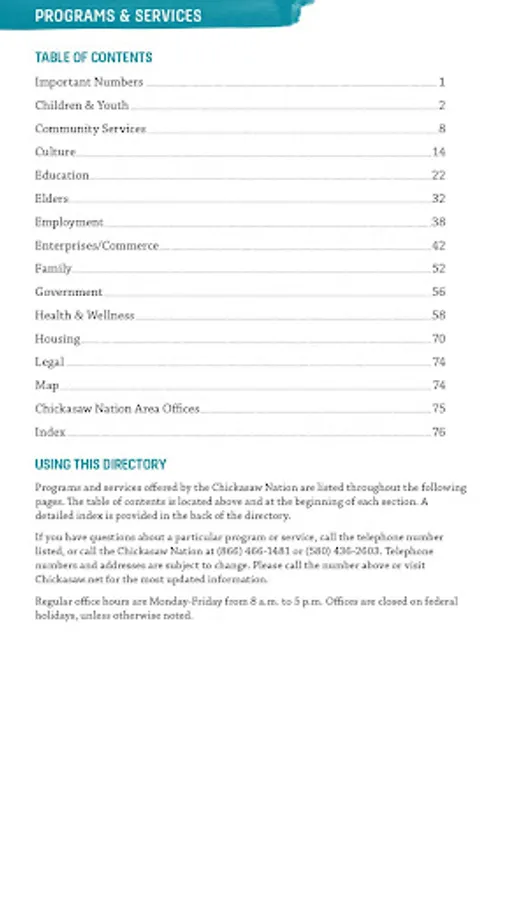 Chokma! The Chickasaw Nation brings you the electronic version of the Programs & Services Directory for Chickasaw citizens at-large (citizens or other Native Americans living outside the Chickasaw Nation boundary).