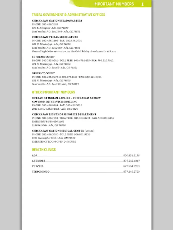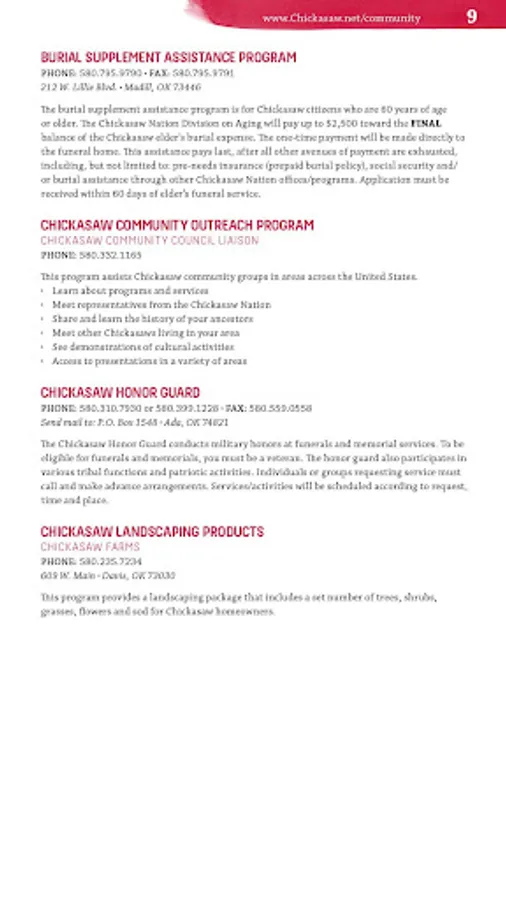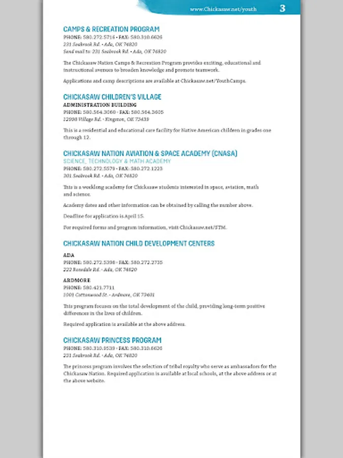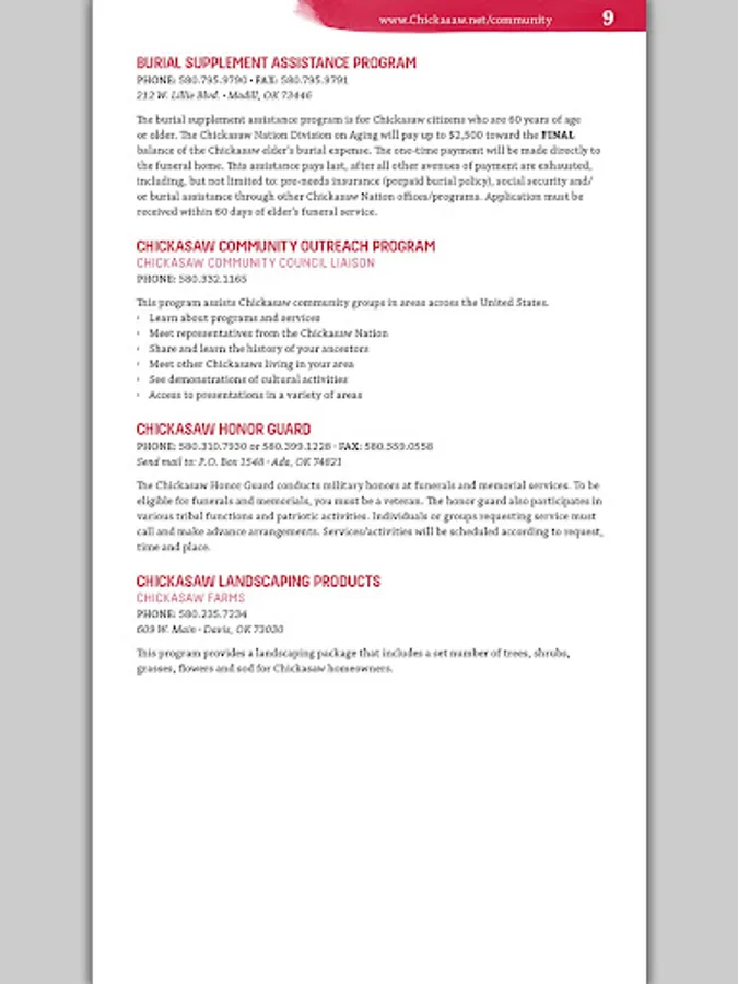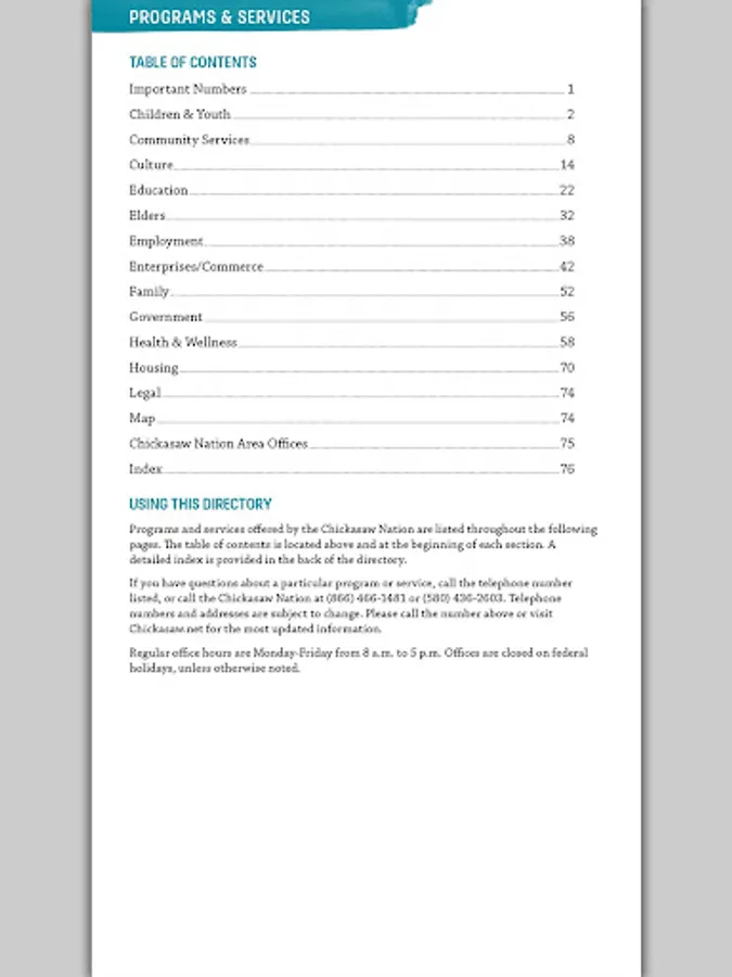 Chokma! The Chickasaw Nation brings you the electronic version of the Programs & Services Directory for Chickasaw Residents (citizens or other Native Americans living within the Chickasaw Nation boundary).