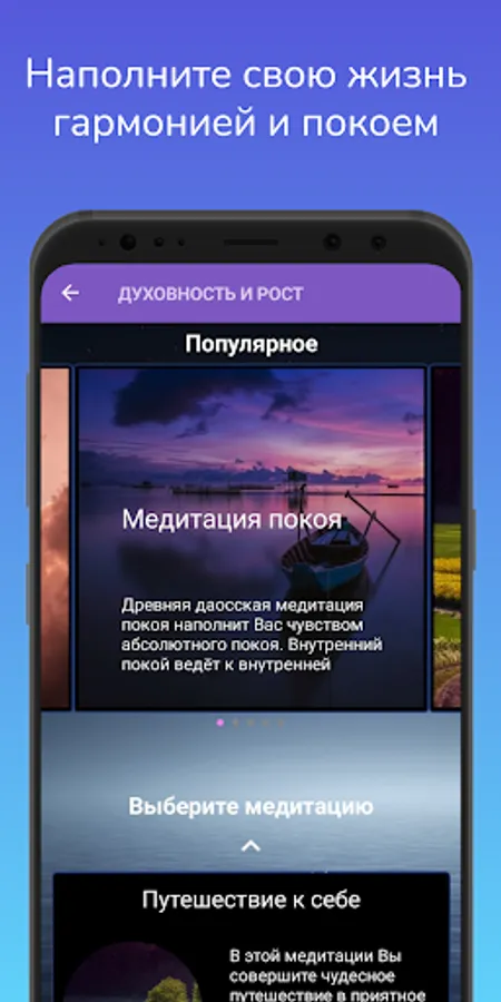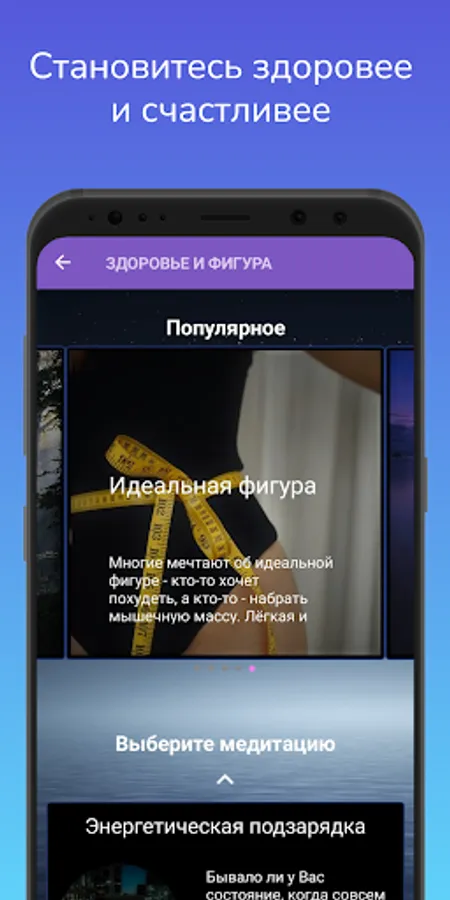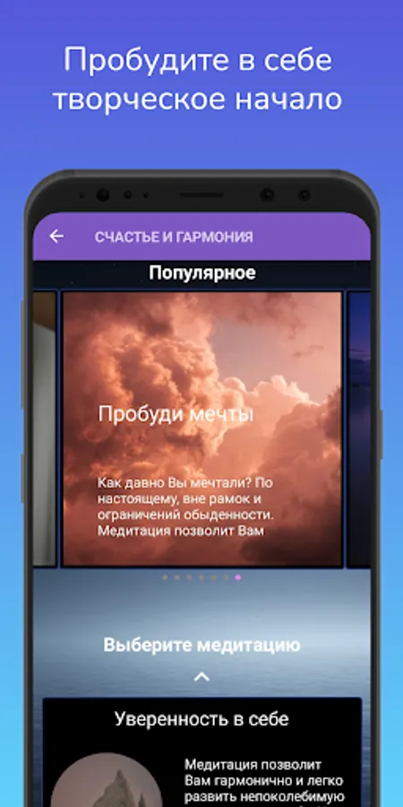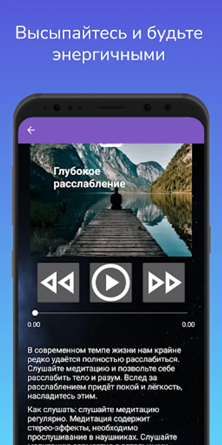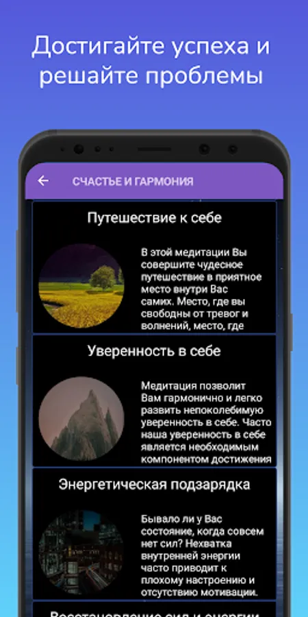 Each meditation has the structure of a holistic psychological session. Guided meditations cover a wide range of topics, from relaxation and sleep meditations to self-development and personal problem solving and success.