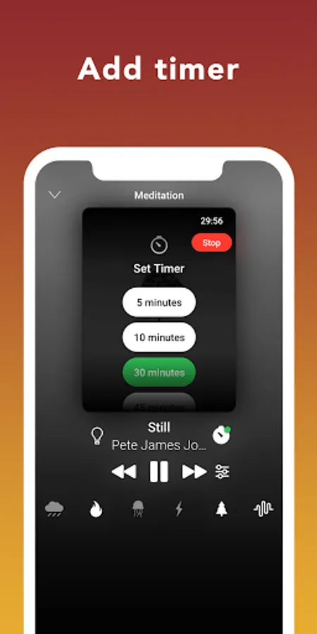 Select a song that fits best to your taste. Customize your music by adding nature sounds and alpha waves. Finally add timer to start your meditation session.