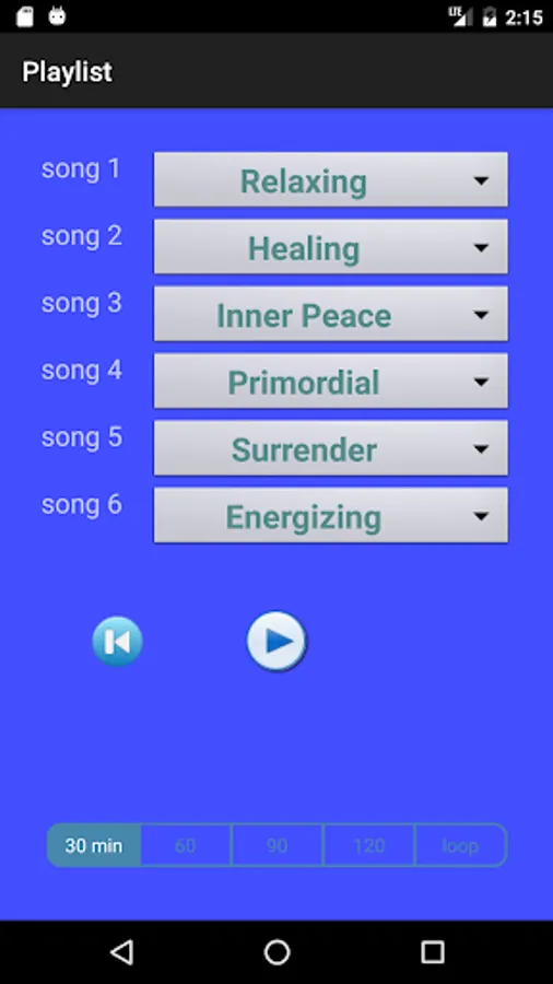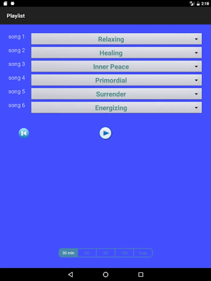 With this App, you can choose playing times from 5 to 30 minutes or forever loop for each selection, or use a playlist option to create and play a sequence of music in any combination. The Playlist gives you the option of up to 120 minutes or forever loop of playing time.
