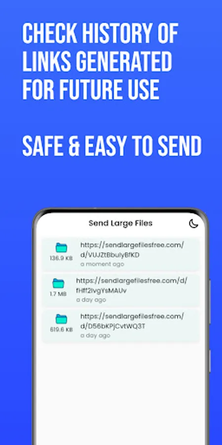 Can’t remember which file you shared and with whom? Secure File Transfer Feature lets you save history that you can look back to keep a record of Large Files you shared with other android or ios devices.