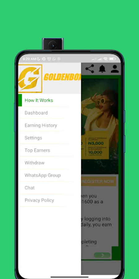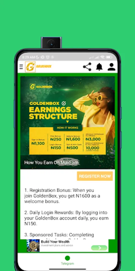 In summary, on GoldenBox, you earn N1600 as a registration bonus, N150 for daily logins, and N250 for completing sponsored tasks. Additionally, you can earn N1,600 for every user you refer to GoldenBox through the referral program.