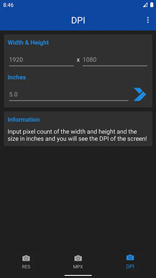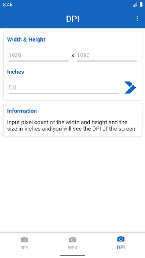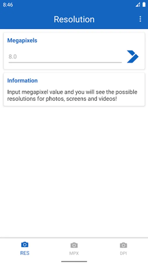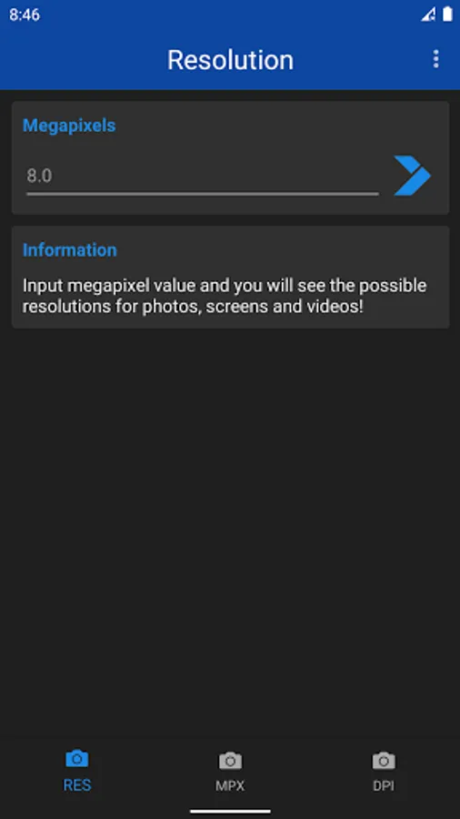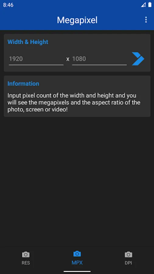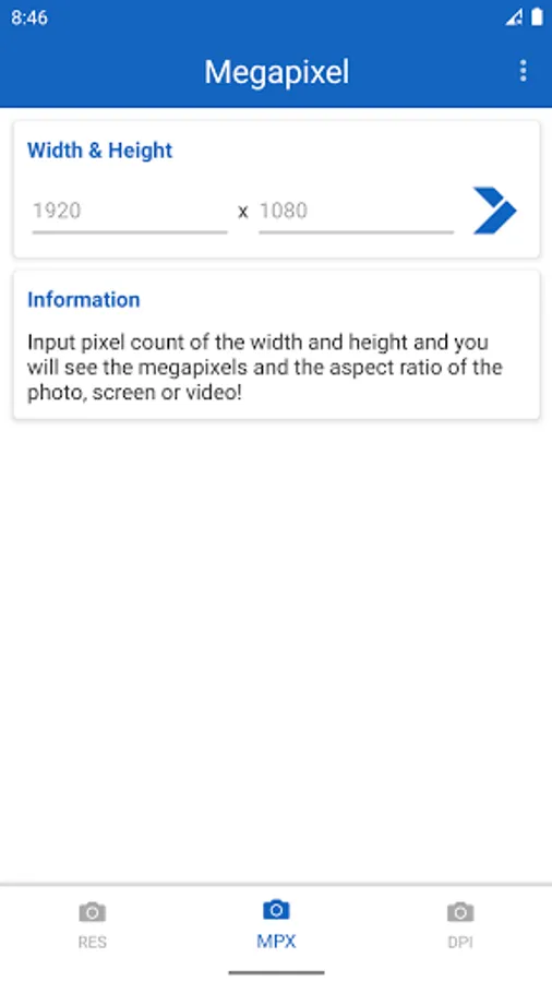 Megapixel Calculator is very useful and informative app for understanding different resolutions. Just type number of megapixels and you will see all possible variations of screen, photo and camera resolutions. Or even more - type the resolution of your photo, screen or camera, and the app will tell you the aspect ratio and number of megapixels. Now app includes DPI calculator. Just input screen resolution and size in inches, and the DPI of the screen will be shown.