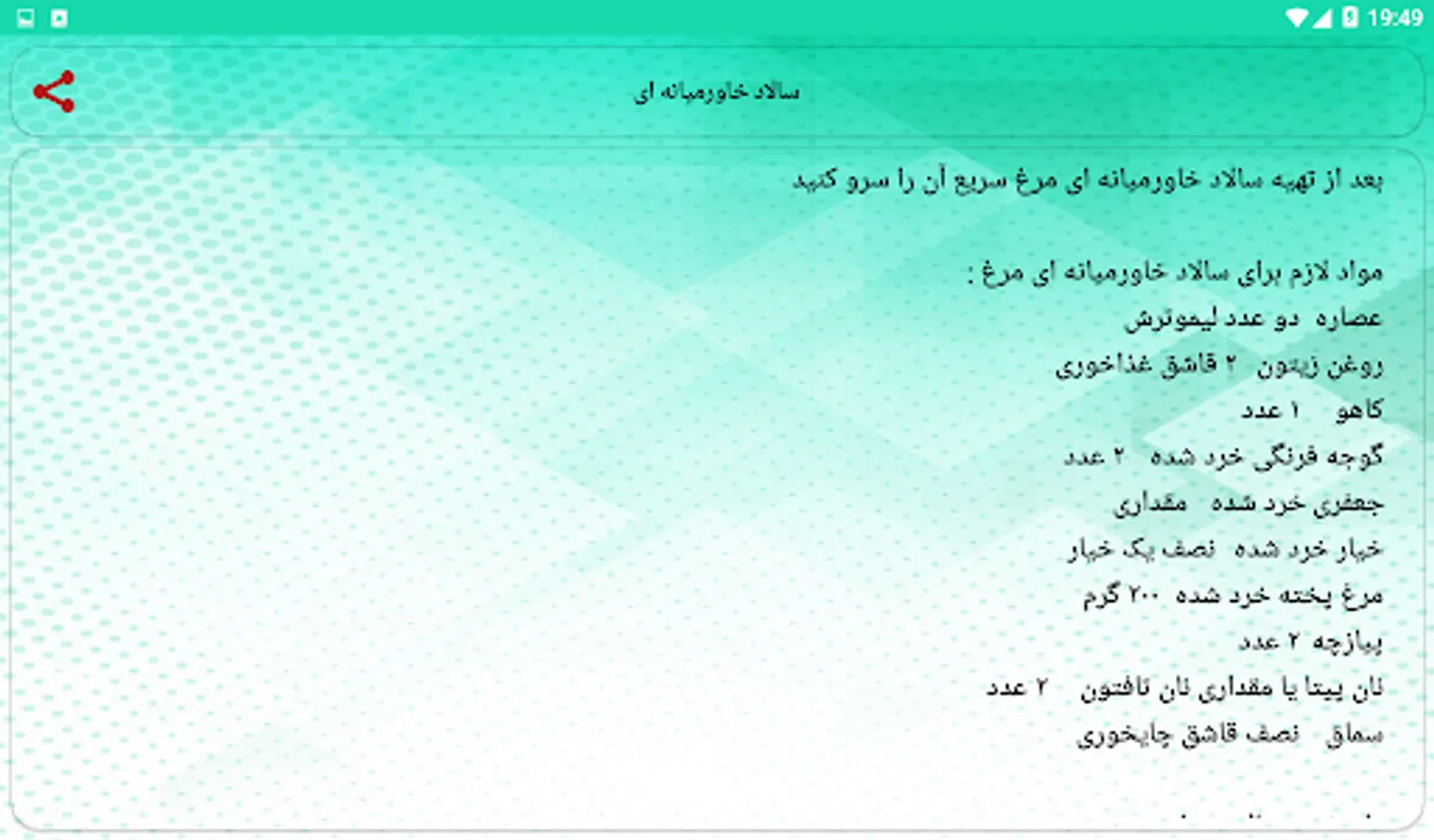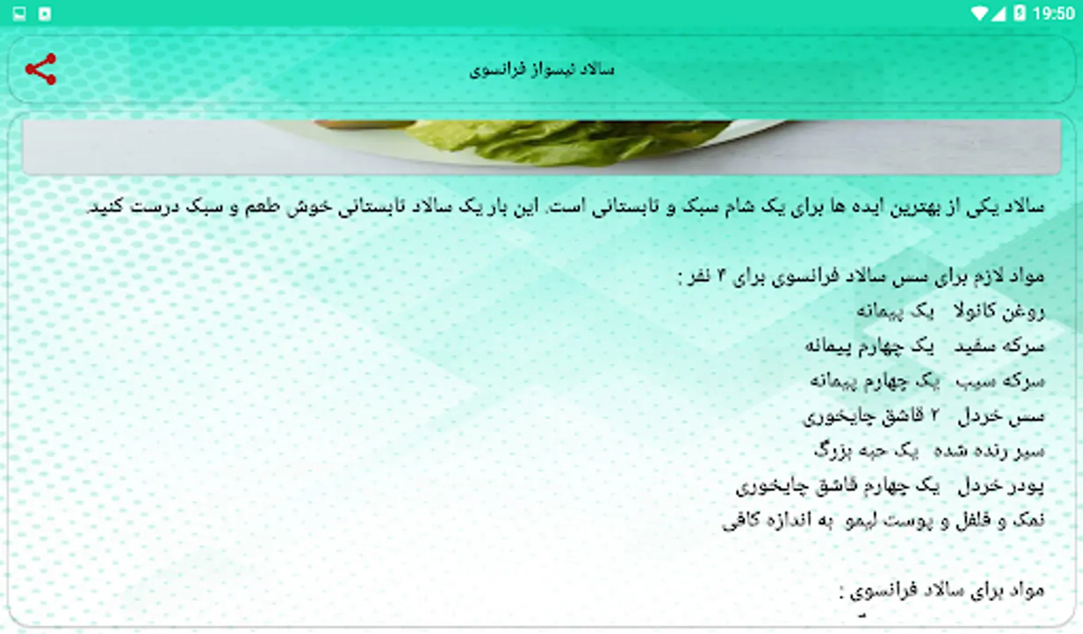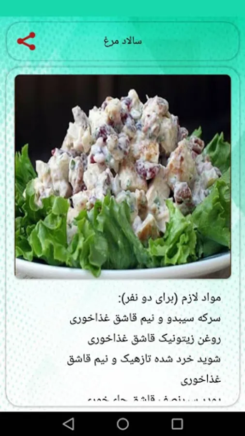 For example, in this application, we have explained how to prepare an Italian salad with chicken, Greek salad, French salad, chicken salad, Caesar salad, Shirazi salad, pasta salad and other delicious salads.
