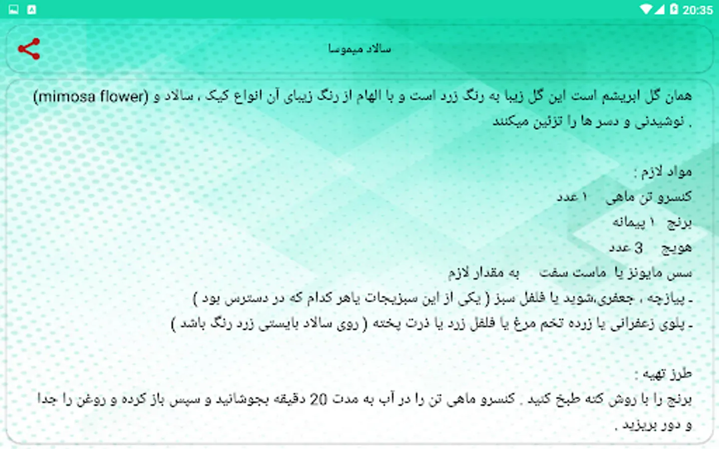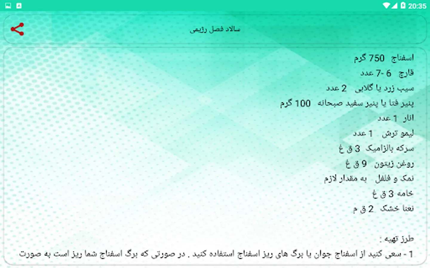You can easily prepare delicious and delicious food for yourself and your family at the level of a professional chef, using the methods of preparing various Iranian and foreign salads that we have collected for you in this software.