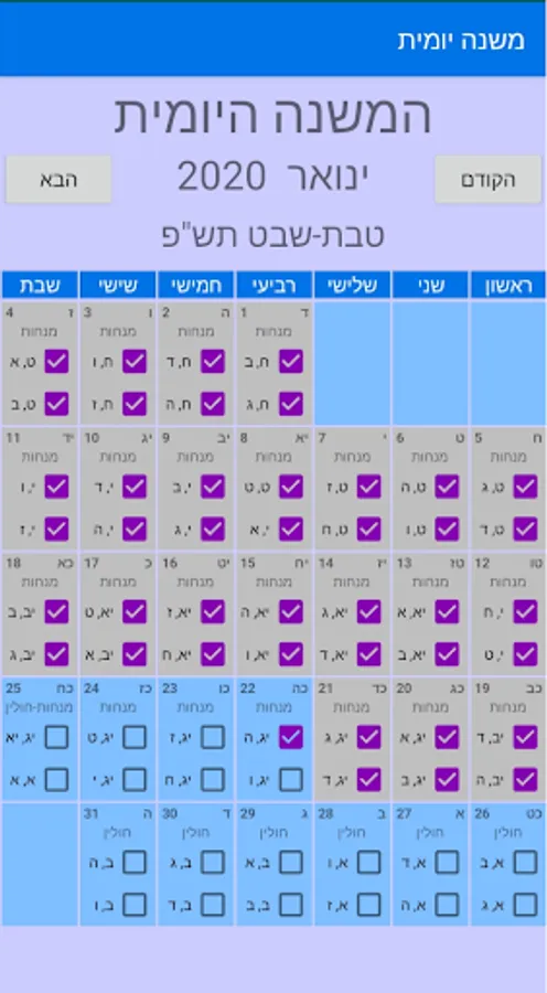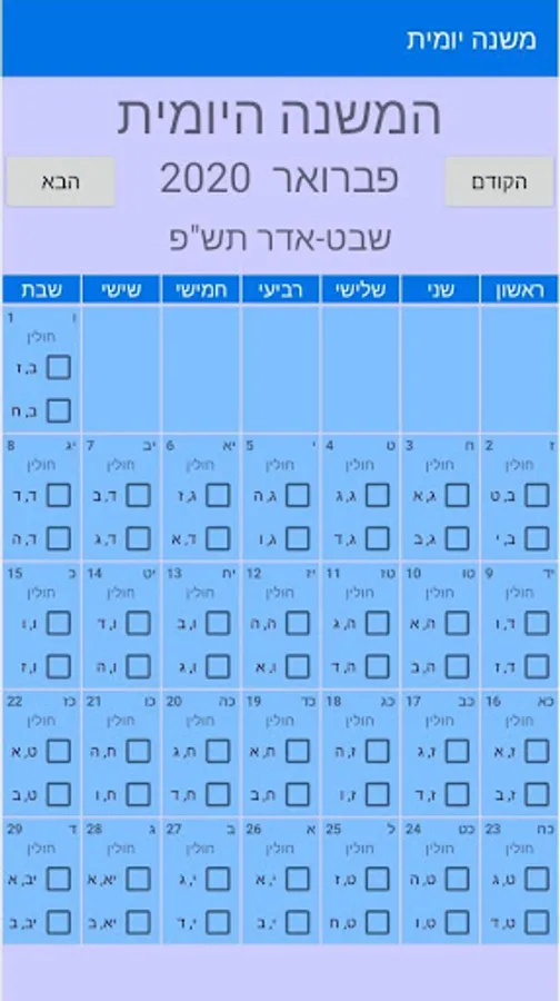 The app displays the daily sub-calendar according to the Hebrew (and Hebrew) according to the current daily sub-cycle, allowing you to mark the secondary you learned each day.