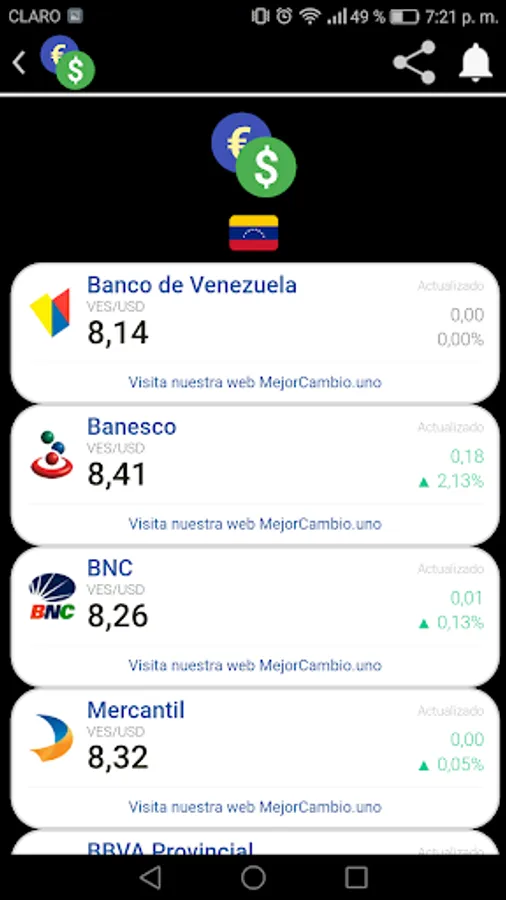 Staying up to date with the price of the dollar has never been so easy. Better Exchange is the tool that allows you to be informed about the movement of the price of the dollar with respect to the Bolívar