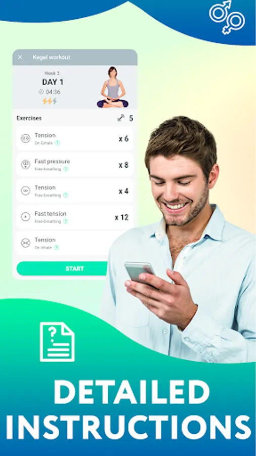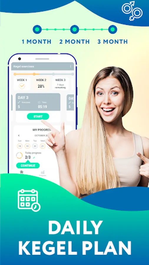Daily Kegel exercises for men and for women are a special type of training to strengthen and maintain your's inner body health. A pelvic floor fitness app will help you develop and strengthen these muscles simply and effectively. The virtual instructor will assist you and help you all over 8 weeks schedule.