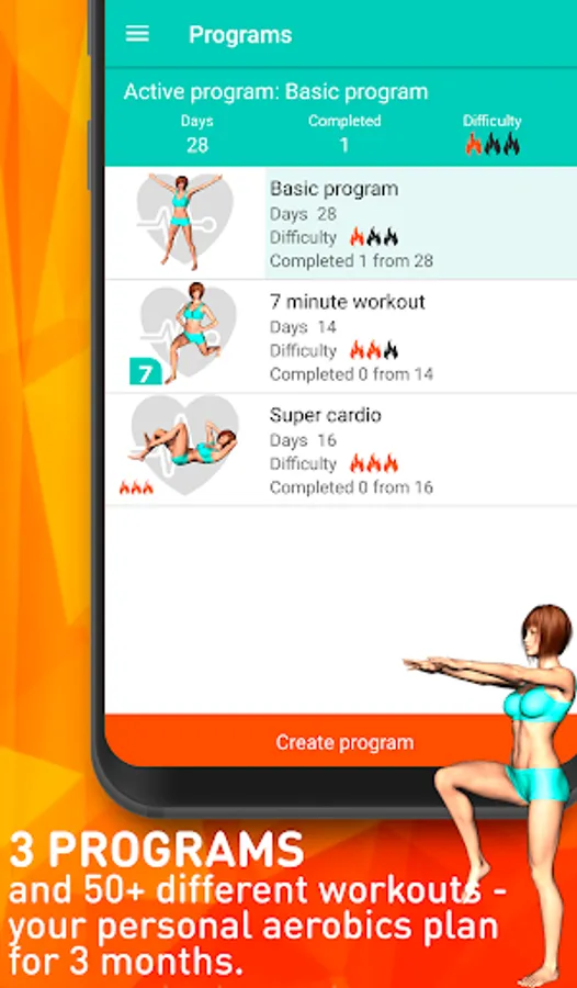 ✓ 3 detailed training programs and more than 40 different workouts - aerobics for beginners, everyday cardio workouts to burn fat, and complete aerobics program of increased complexity;