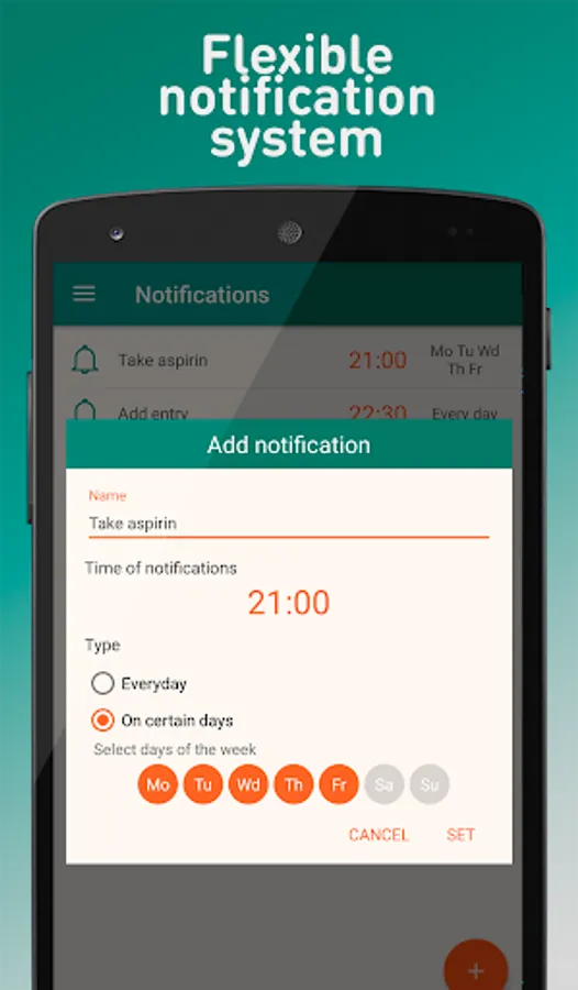 > Notifications system will help you remember to take the medicine, and also enter a record about it;