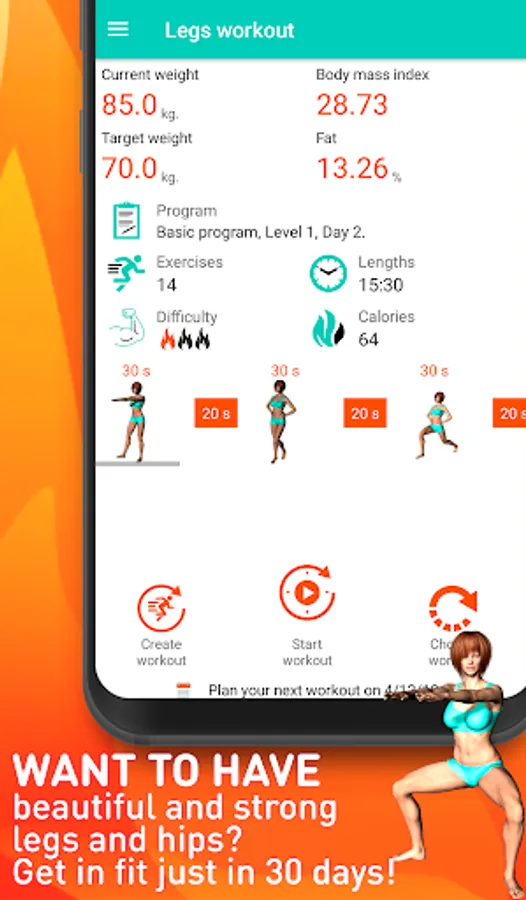 🏅 Very often, there is not enough time to visit the gym, but if you have 10-20 minutes free, then this application will serve as an ideal assistant in the construction of beautiful legs and hips, just try to start the first program and your 30 days legs challenge will begin. Also, we have built a system of legs training in such a way that it will create a steady habit of regular legs exercise for thighs and calves, and you will not only achieve amazing shapes and get beautiful legs, but also to maintain great effect in time!