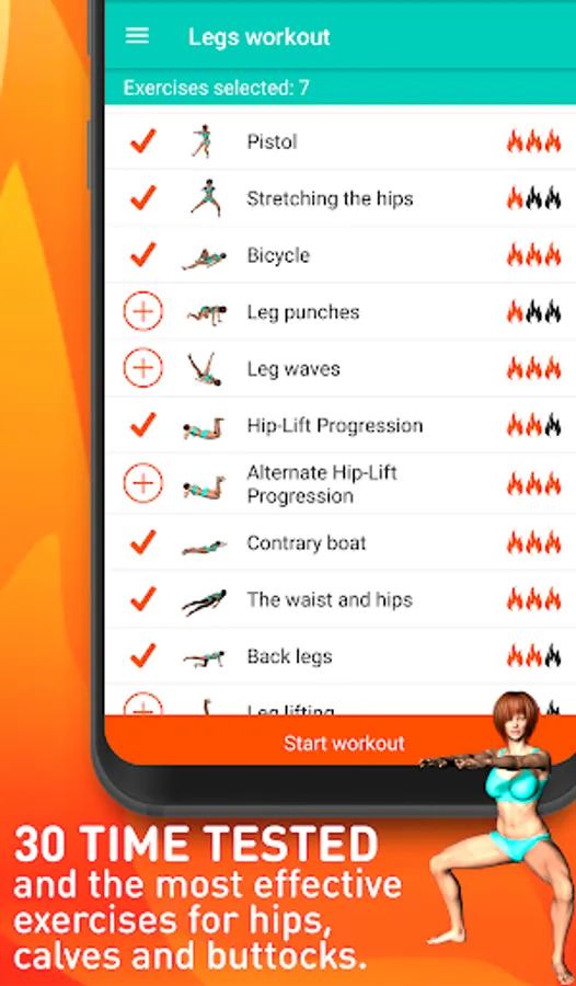 ✓ 30 different legs exercise with different levels of difficulty for all muscle groups, we've chosen the best lower body exercises for fastest effect – either it is calves exercise or thighs exercise;