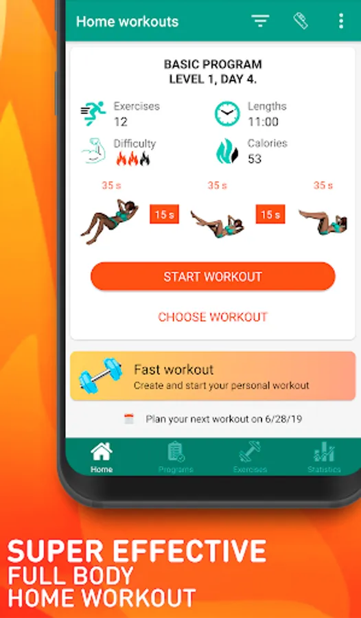 👍 The application is suitable for all age groups, men and women and all those who value their time. Home training will allow you to regularly give time to sports and physical activity, even if you have very little of it. Home workouts app can also complement your other activity, serve as an excellent gymnastics and warm-up for all the muscles of the body. Just try to do the first home workout, log your results and you will definitely make all your muscles work! By the way, an average home workout program length takes 15-20 minutes a day, so instead of surfing the web or watching TV, just turn home exercises program on and get healthy and sporty day by day.