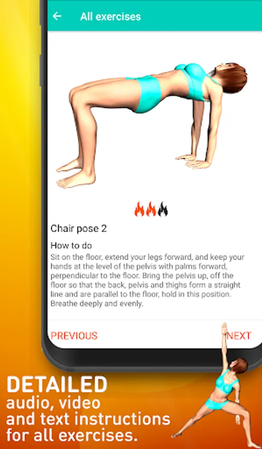 ✓ Each flexibility yoga exercise has detailed video, audio and text instructions – so you can in really short time find out how to perform most effective yoga stretch postures;