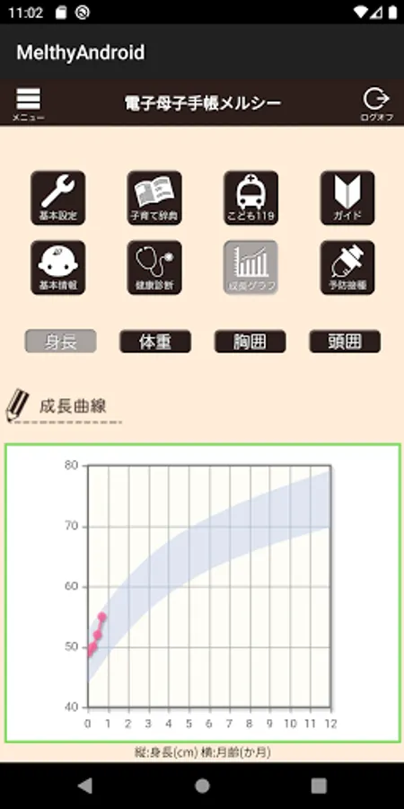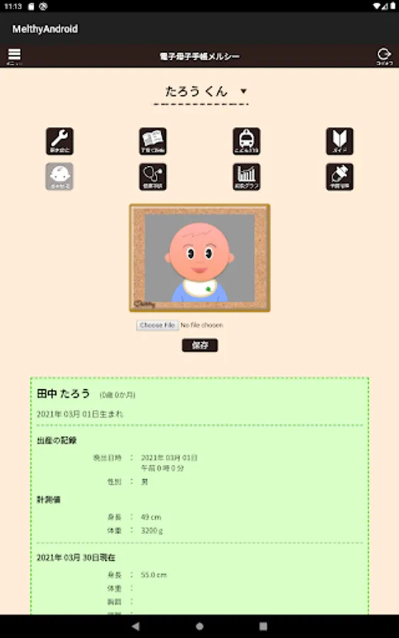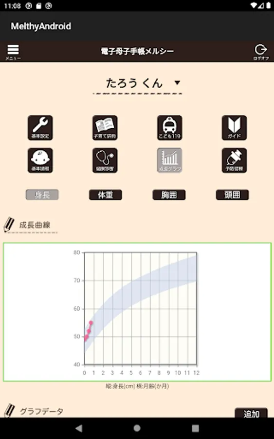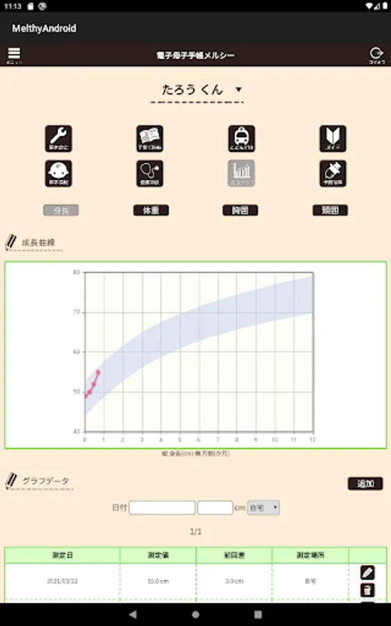 It covers all the inspection items listed in the Maternal and Child Health Handbook, and automatically selects and displays the items according to the age and age. The height and weight registered here can also be confirmed as a graph on the growth graph page.