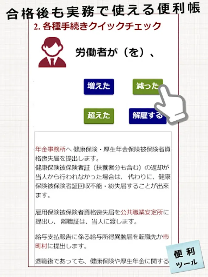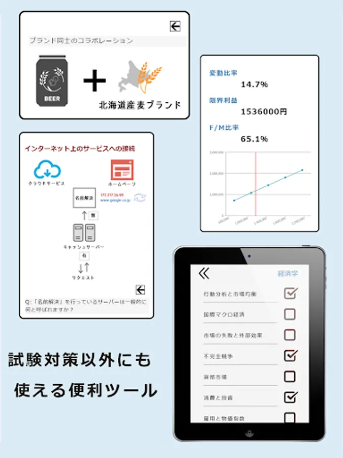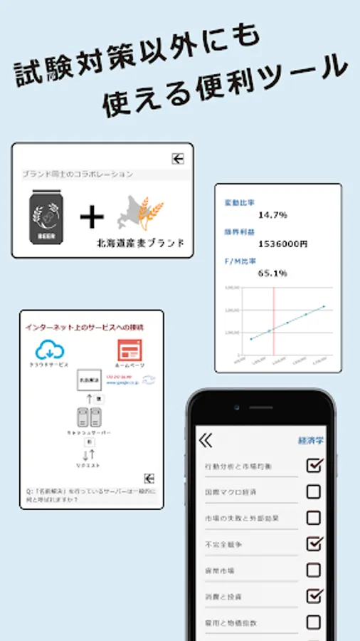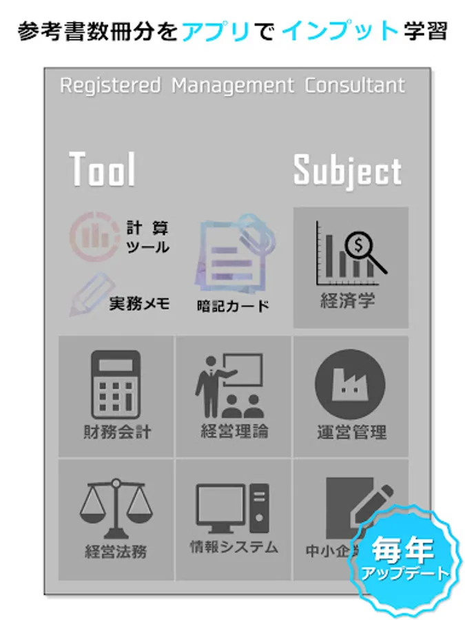 This app contains tools and information that you can use in your daily work so that you can use it for a long time even after passing the Small and Medium Enterprise Management Consultant Examination.
