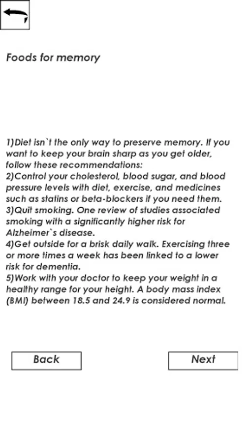 The articles contained in our app will tell you about memory and help you build a diet that will improve your memory. Tests and training sessions will also help you develop your memory skills and analyze how strong your memory is.