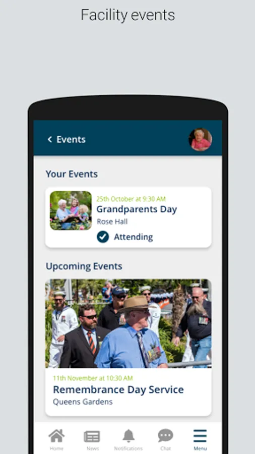 Menarock is a new way for families of Menarock aged care residents to communicate and gain insights into the daily activities within a Menarock facility. The app will feature inter-family group chat, POA to facility chat, support, news, events and activities allowing families to easily stay in touch with their loved one's daily activities.