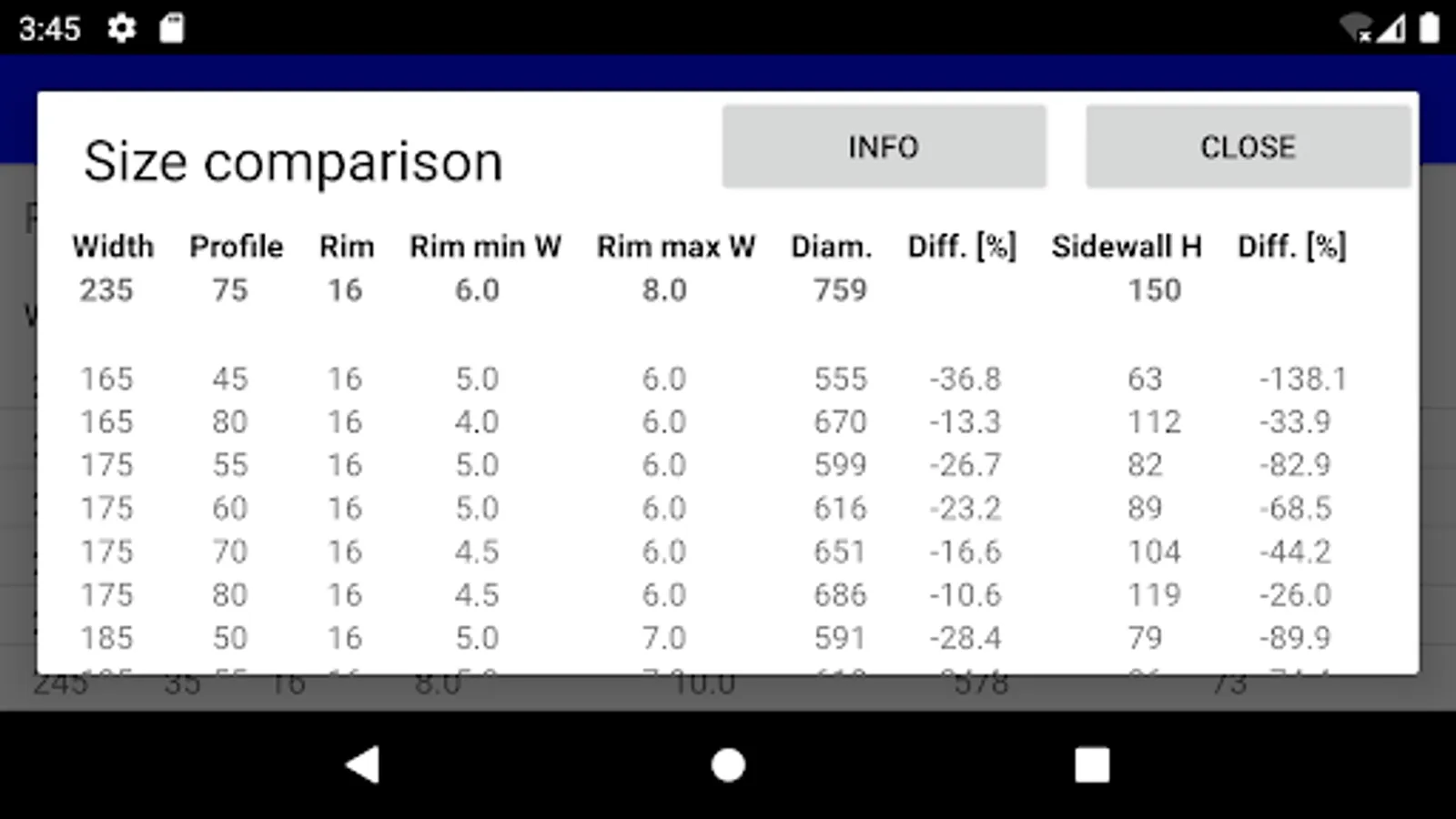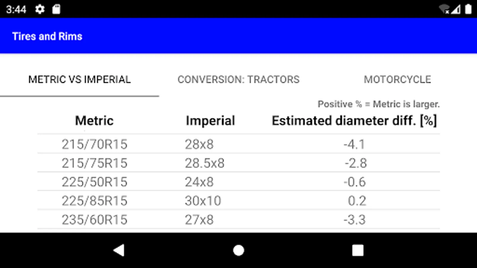 - Comparisons of metric and imperial tire sizes now also for motorcycles and tractors