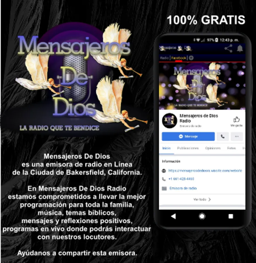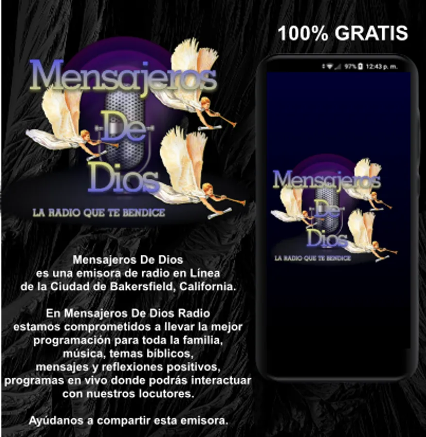 At Mensajeros De Dios Radio we are committed to bringing the best programming for the whole family, music, biblical themes, messages and positive reflections, live programs where you can interact with our announcers, help us share this station.