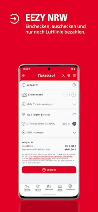 - EEZY.NRW: If you only travel occasionally by public transport in the Düsseldorf area then choose the Check-In-/Check-Out-Tarif eezy.nrw. Simply check in with the App and check out again at the end of your journey. The fare is calculated automatically according to the linear kilometres travelled. The total cost per month is no more than 49 euros.