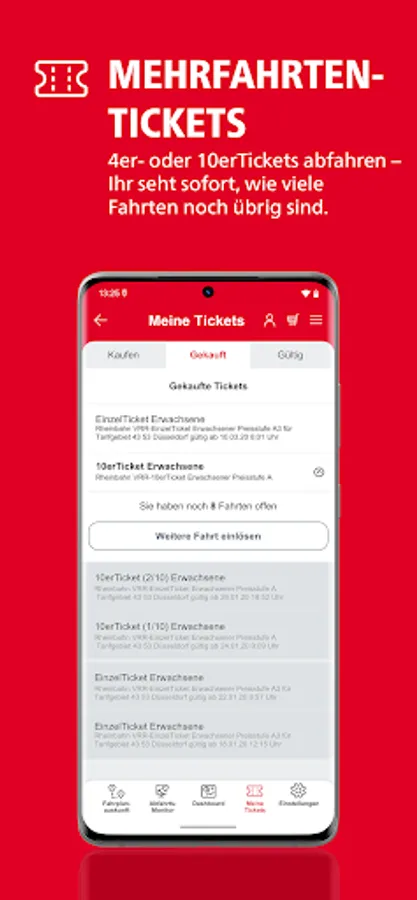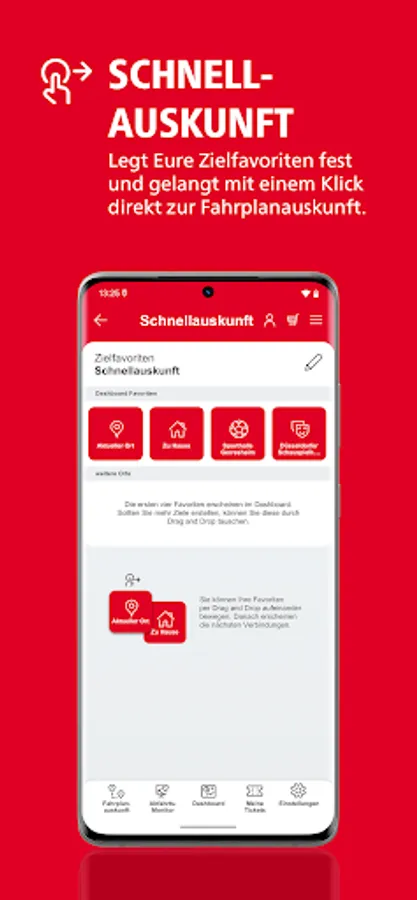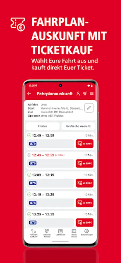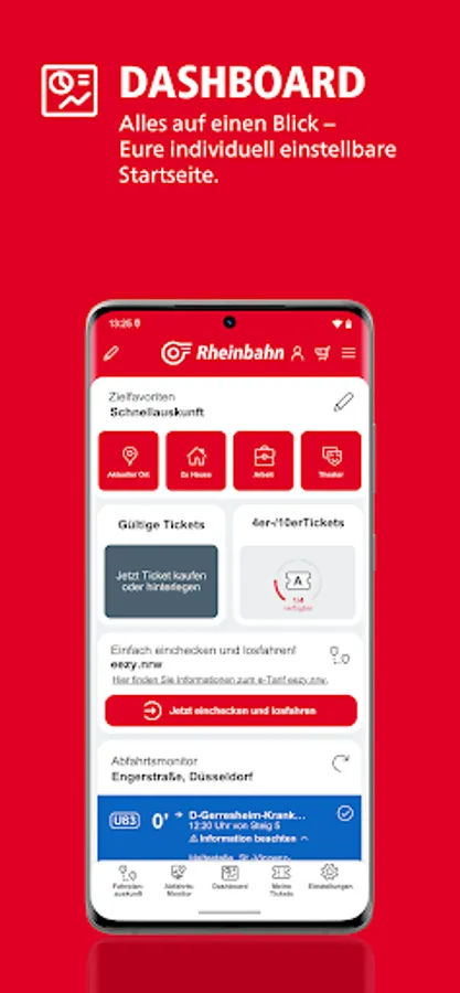 - DASHBOARD: When you open the App, your personal dashboard opens first with the main functions for travel around Düsseldorf by public transport (ÖPNV). You can buy the Deutschlandticket here, find an overview of the tickets you have bought and are valid, and can store your most important connections and lines in “Schnellauskunft” (Quick Information) or “Abfahrtsmonitor” (Departure Monitor).