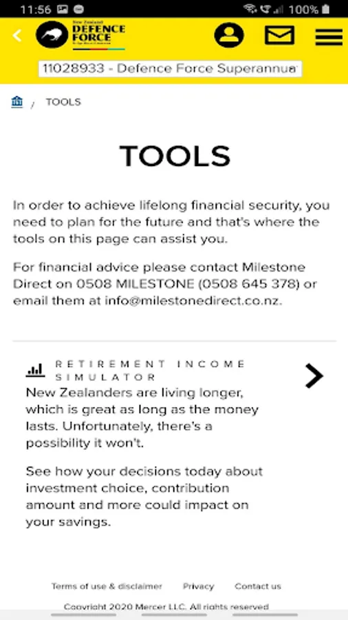 This app is available to all New Zealand Defence Force KiwiSaver Scheme, New Zealand Defence Force FlexiSaver and Defence Force Superannuation Scheme members. You can manage your personal account, calculate your likely retirement income, check and change your investment options all from your mobile device.