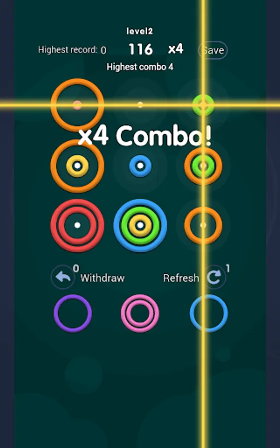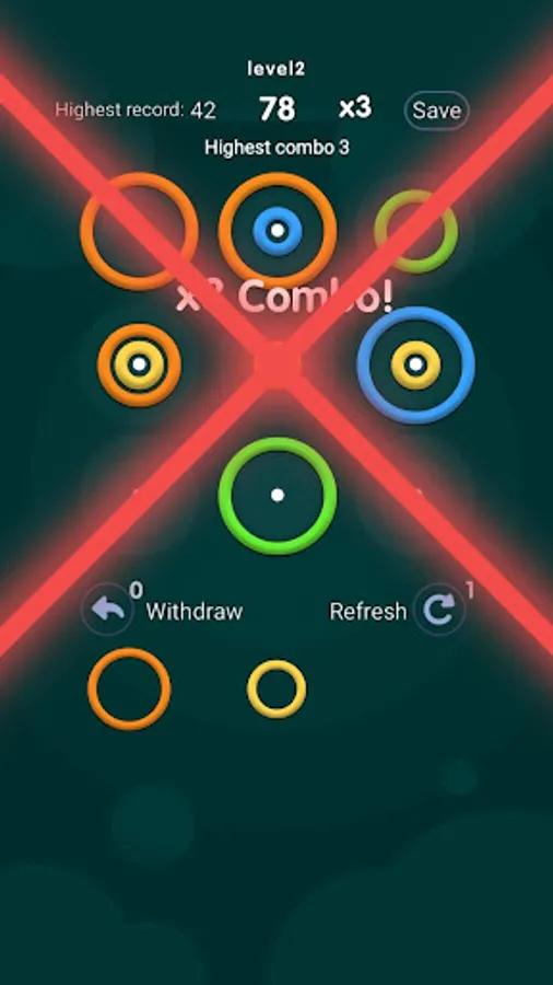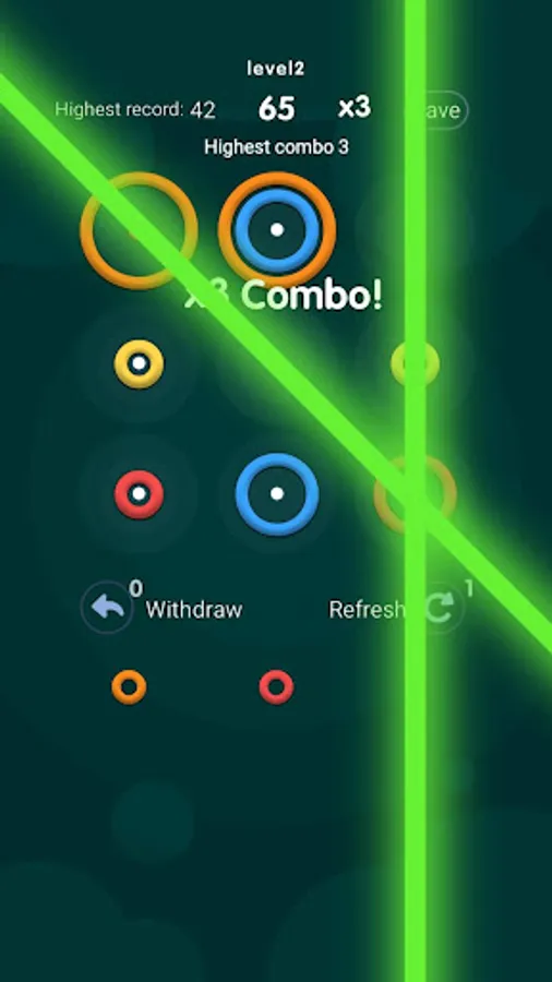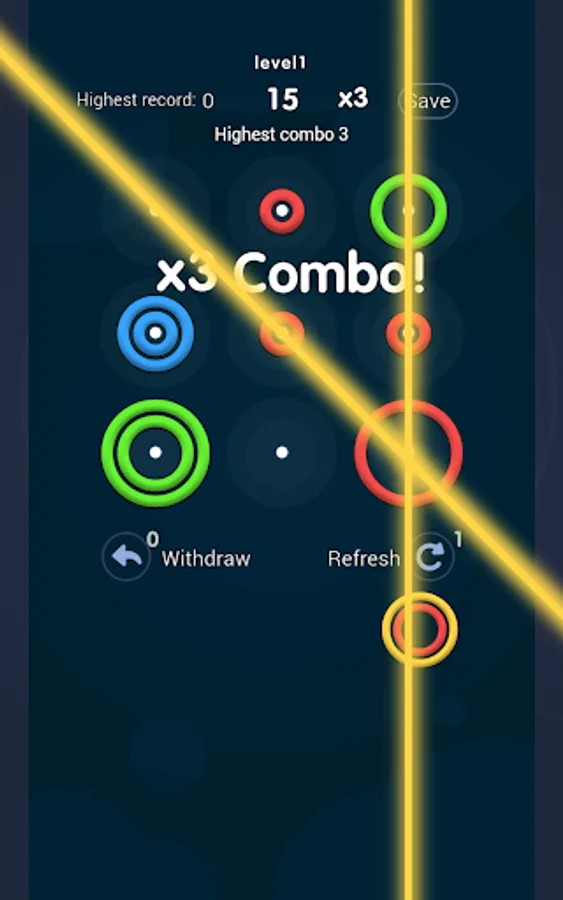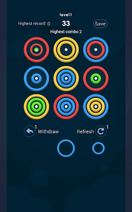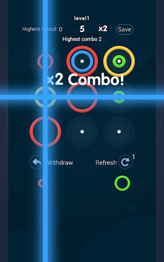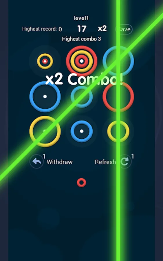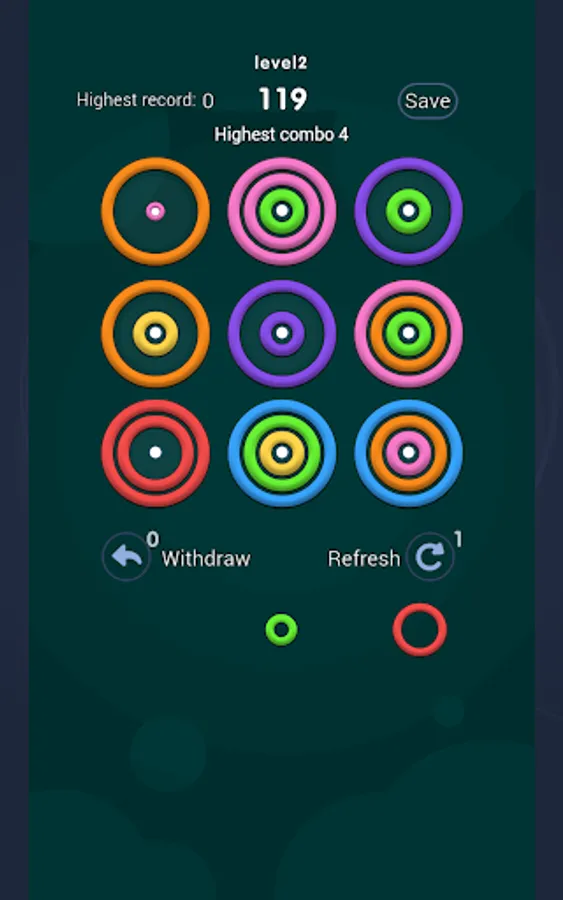 2.Put the same color circle on a line to eliminate and when there is no place to put the circle the game will be over.