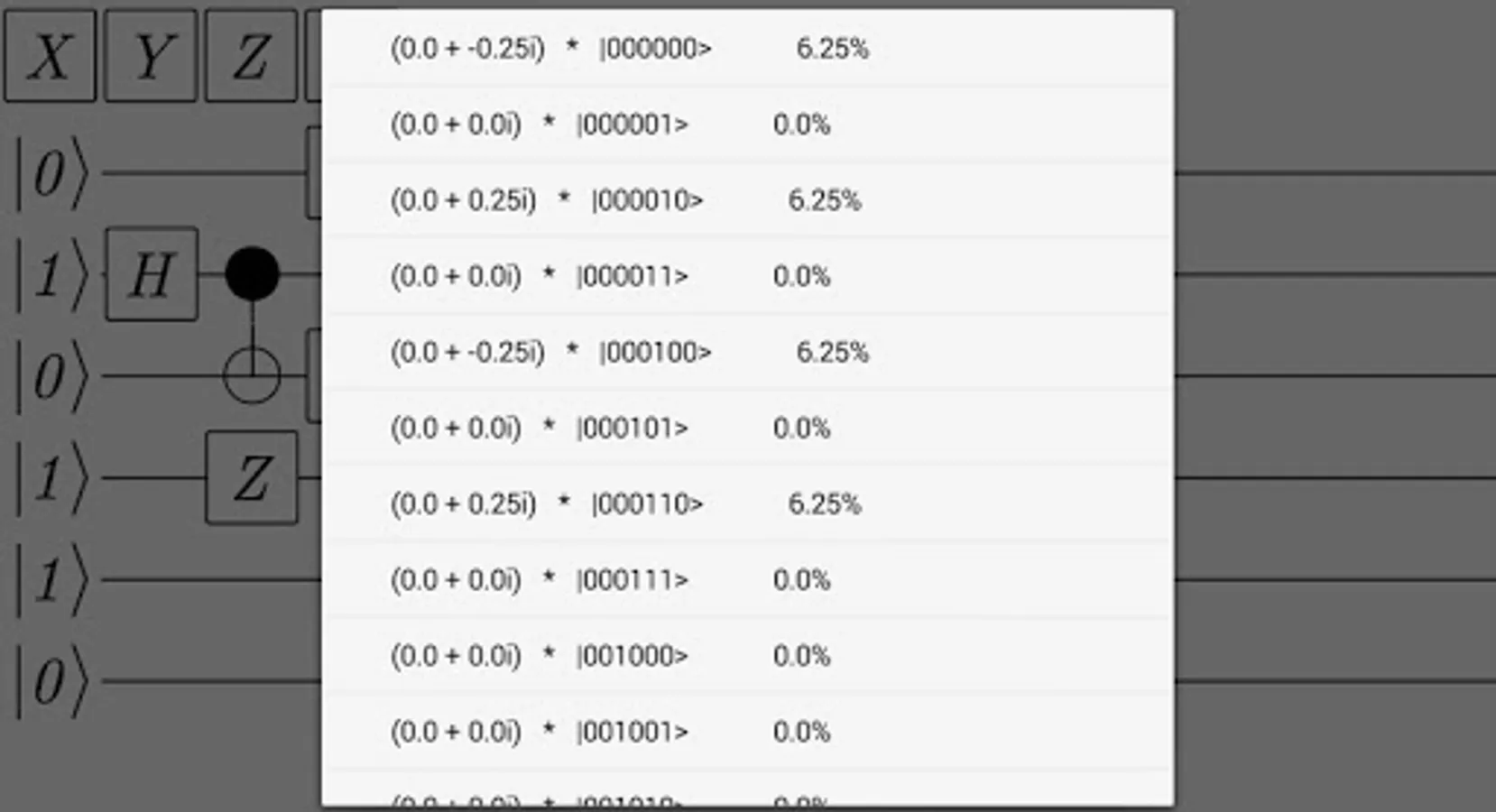 Quantum Circuit Simulator is a simple application that lets you simulate the behaviour of primitive quantum gates on your mobile device. You can simulate the behaviour of Pauli-X, Pauli-Y, Pauli-Z, Hadamard, C-Not and Swap gates on up to 6 quantum bits.