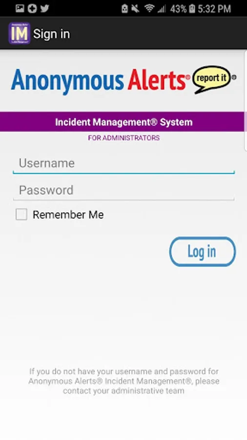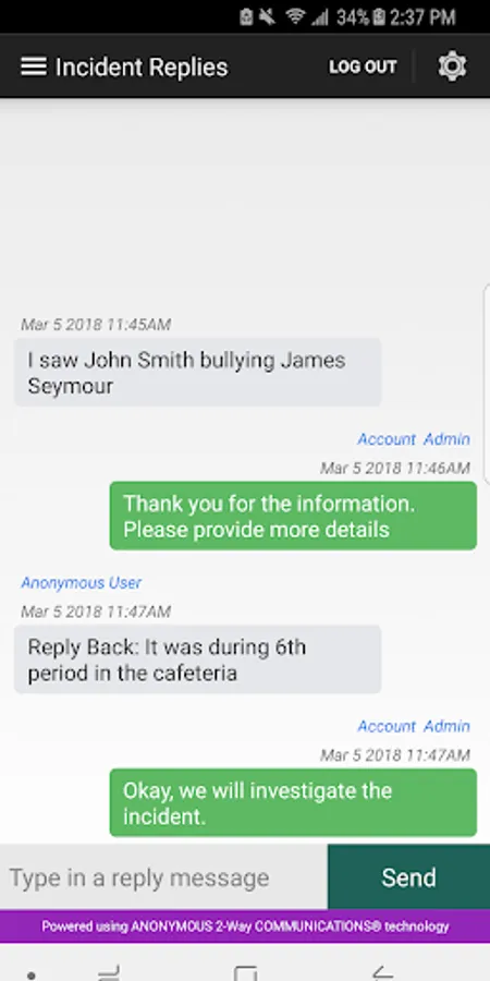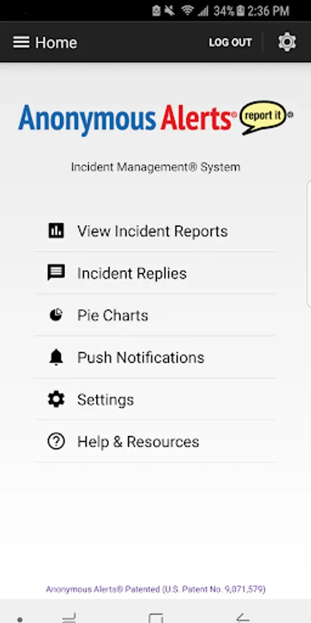 The Anonymous Alerts® Incident Management® App and system was designed for easy access by school campus officials to incident reports. Authorized campus personnel can communicate via anonymous 2-way communications® with a student or parent who has reported bullying, cyberbullying, self-harm, drugs, gang-related issues, guns/weapons in schools and more which may warrant immediate attention by school officials. The system is simple and secure for campus official’s use. The Anonymous Alerts® Incident Management® app is Patented (U.S. Patent No. 9,071,579).