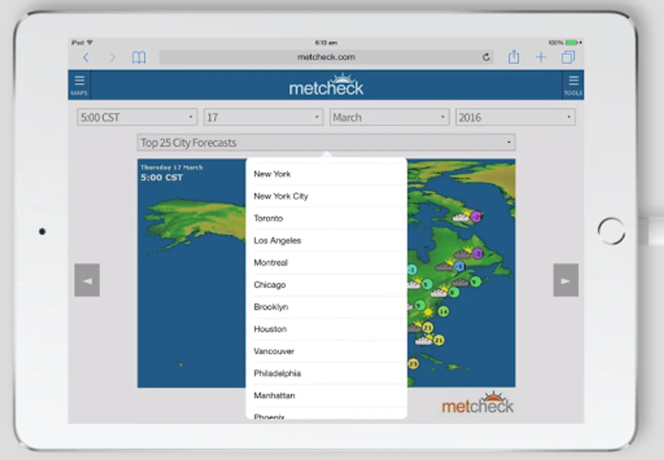 Not just that, but you can select the top 25 cities in each country or click on the icon on the map nearest to your chosen location and as if my magic it reveals the one and only 150 day Metcheck weather forecast for you.