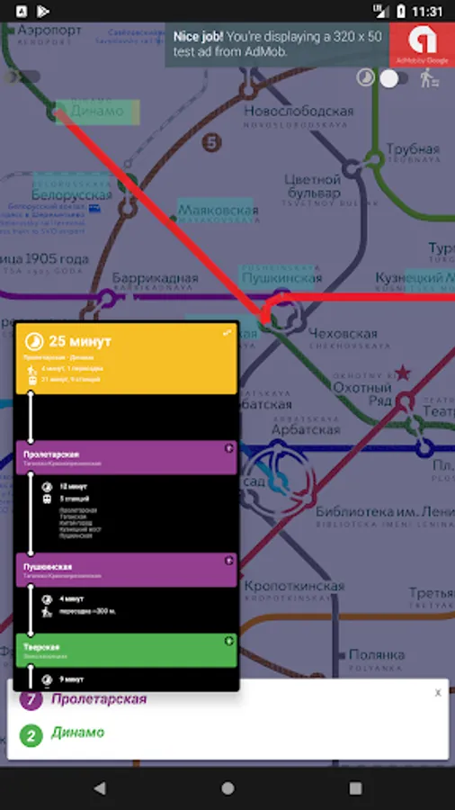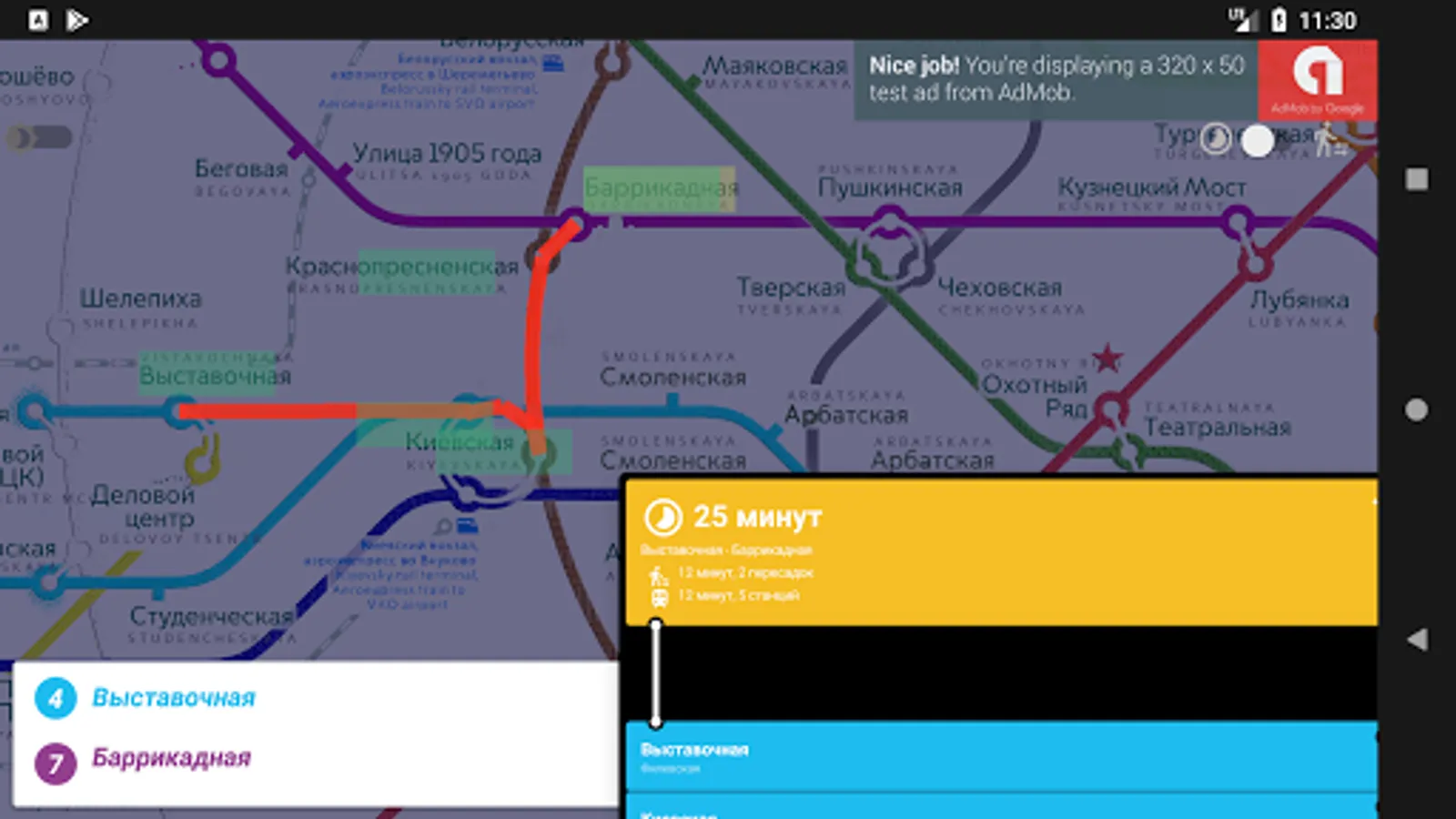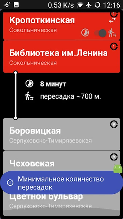 Interactive Moscow metro map with offline path finding. You can use voice search to enter station names if your hands are busy. The app will find the route and calculate the travel time. There is also a switch to the night theme. Two modes of finding a way: in the shortest time and in a minimum of transfers. The "Minimum number of transfers" mode takes into account the transition time - the longer it is, the lower the priority of this path.
