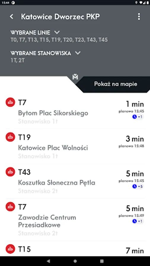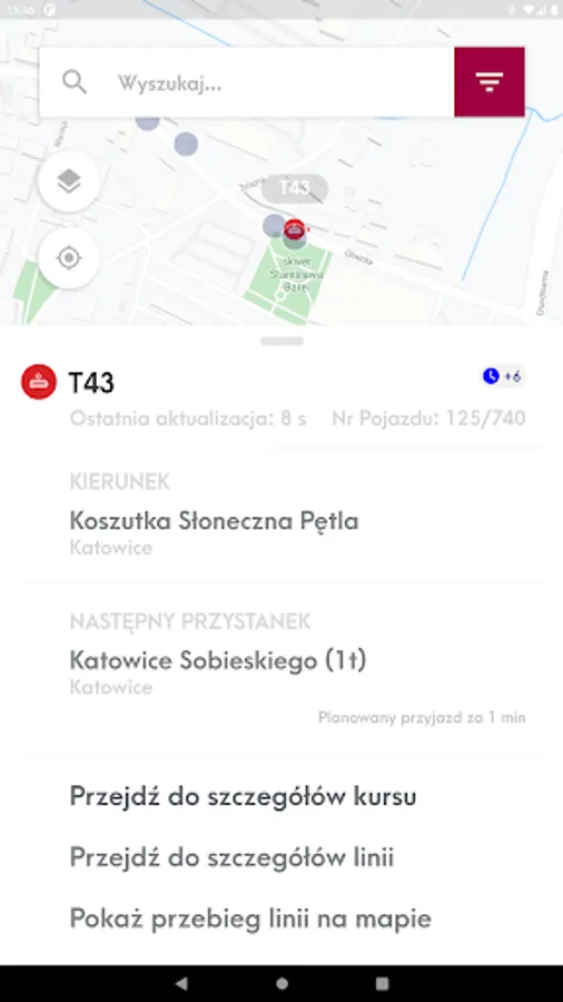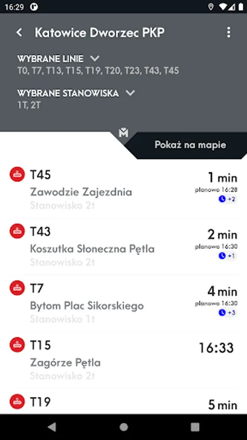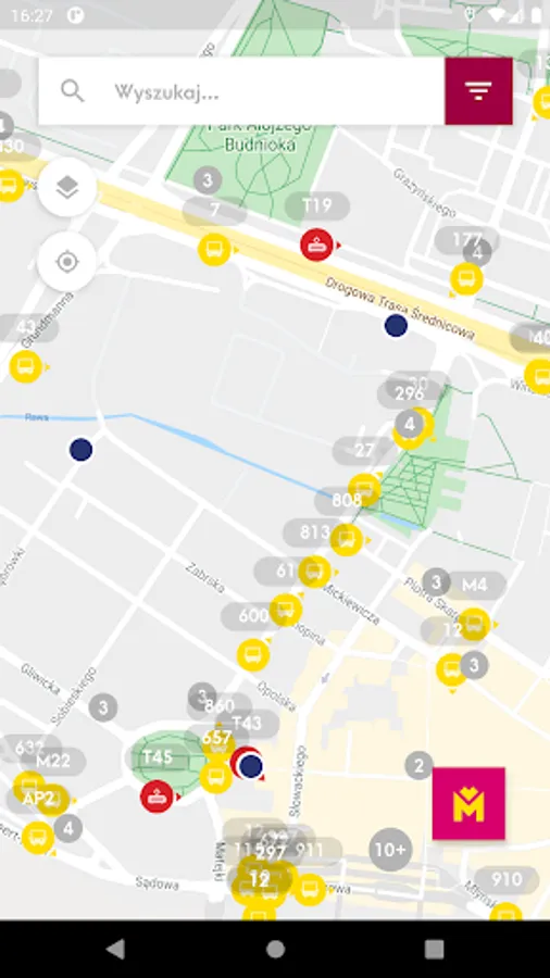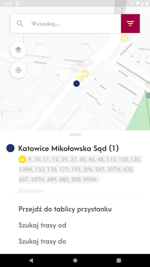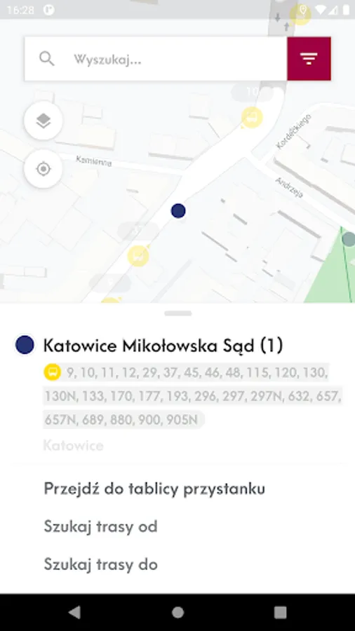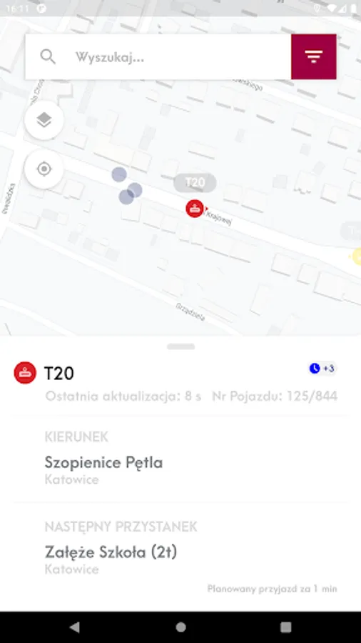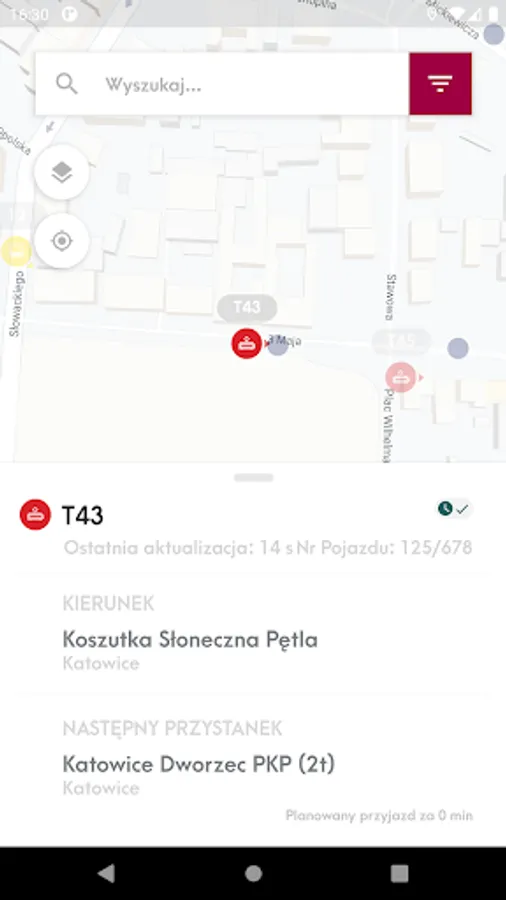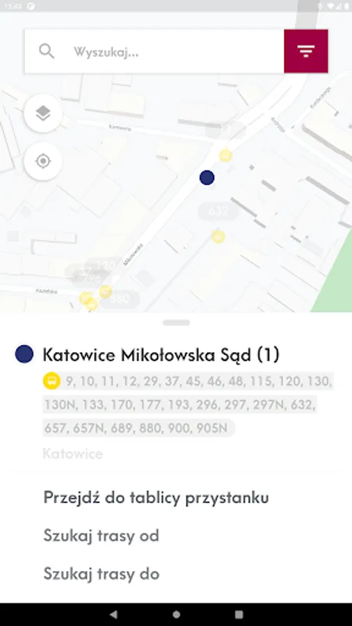 Mobile application presenting the location of vehicles and stops on the map and allowing you to check the actual departure time of vehicles from the stop and search for a connection.