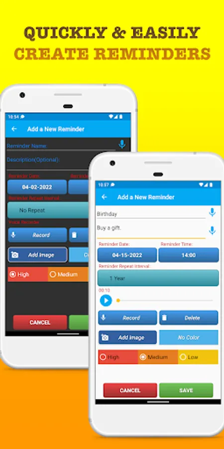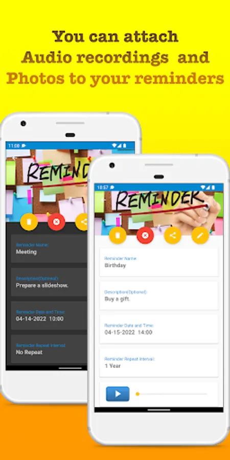 Voice recognition. Reminder app with alarm and notification supports Google speech services to convert your voice to text. So, you can create your messages without typing them with your voice.