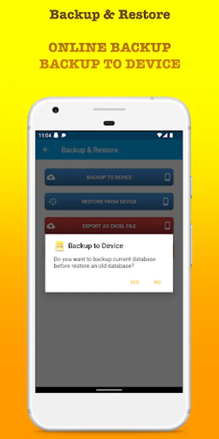 Backup & Restore feature. Online backup (Google Firebase) and option to backup to device. Export as Excel file.
