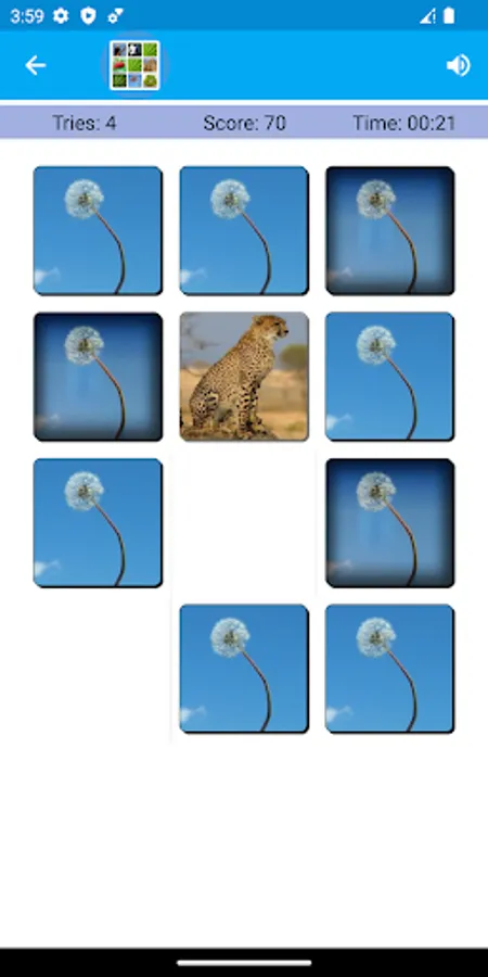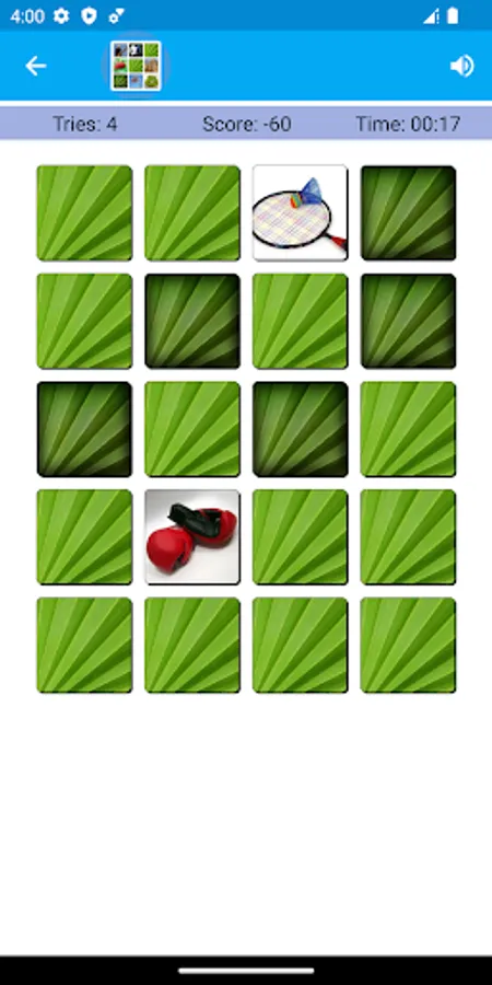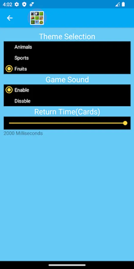 In addition, different themes can be selected for the memory game. Three themes are available currently. These themes are animals, sports, and fruits. The game sound on-off option is there.