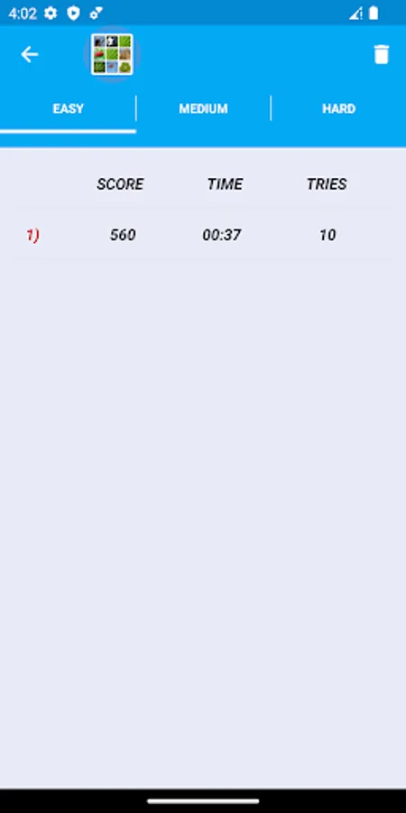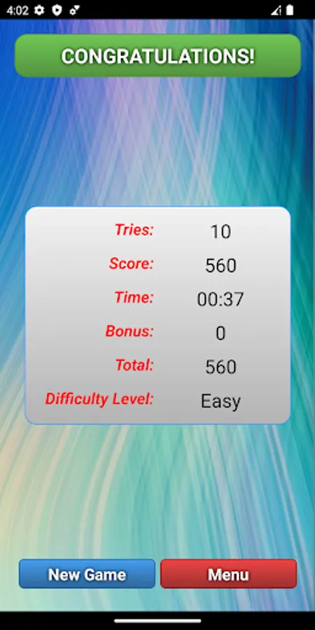The score, time, number of attempts, bonus, and total scores are shown at the end of the game. Scores are stored in the scoreboard. Scores are shown separately according to the difficulty level of the game. The score table can be reset at any time.