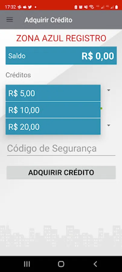 After completing the registration, the user will be able to acquire credits for the purchase of e-Tickets, using his credit or debit card. In the APP, you will be able to view the history of credit purchases made at ParkingFacil, in addition to always having your Balance at hand to purchase new e-Tickets.