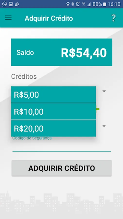 After the registration done, the user can acquire credits for purchase of e-Tickets using your credit or debit card. In the APP can view the history of credit acquisition made in EstacionamentoFacil, and always have to hand your balance to purchase new e-Tickets.