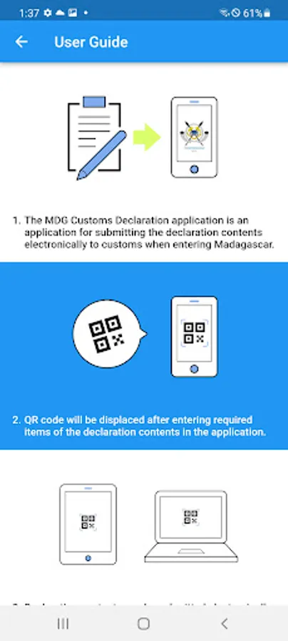 The MDG Customs Declaration application is an application that allows to submit the declaration contents electronically to customs when entering Madagascar. The QR code created by this application can be only used at the following airport that equipped with electronic declaration terminal in the customs inspection area.