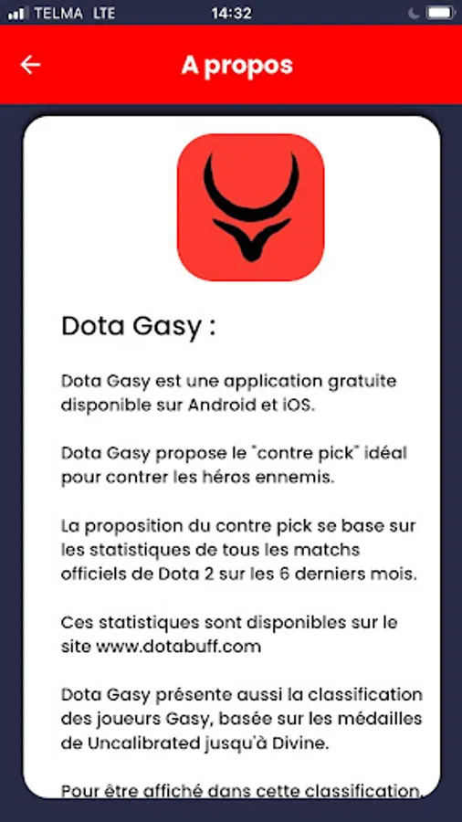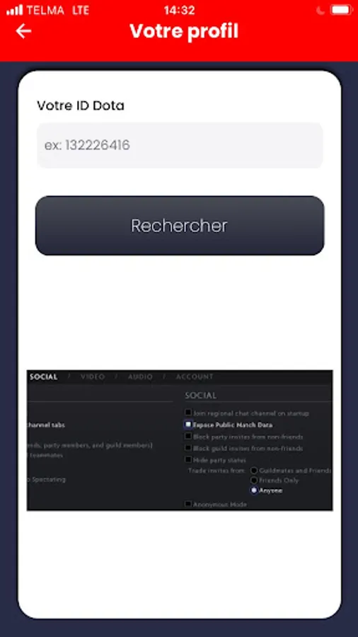 As a Gasy player of Dota, just provide your Dota 2 ID in the app to be displayed in the ranking. By returning the ID, Dota Gasy will automatically retrieve all the information needed for the ranking. Note that your MMR will never be visible to anyone because it remains private in Dota 2. There are no technical ways to automatically fetch the MMR.