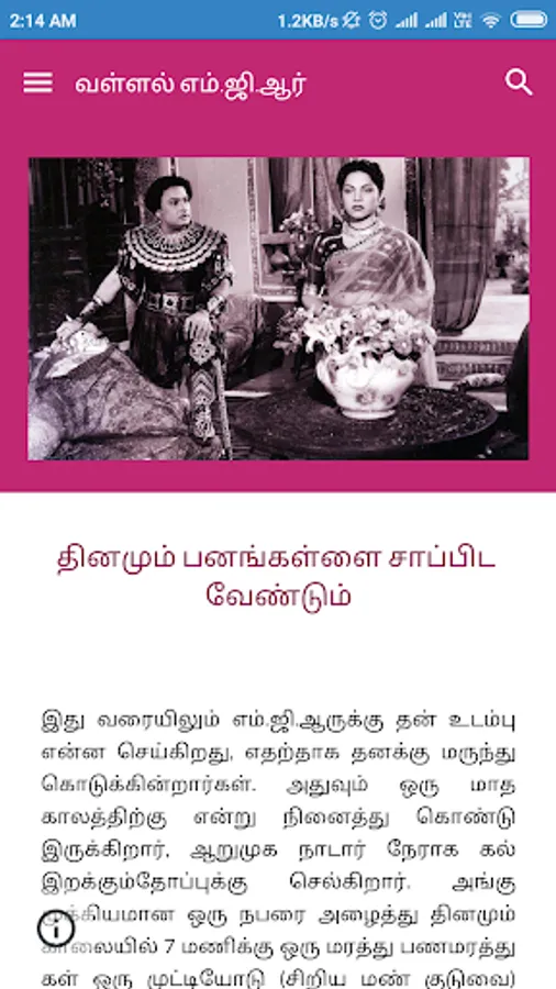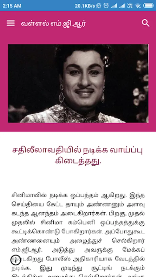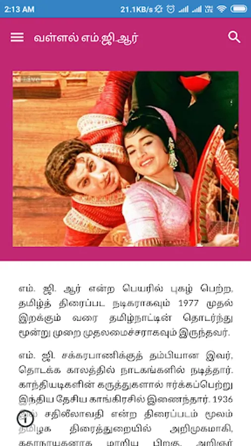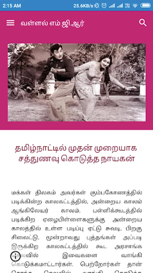 He won the National Film Award for Best Actor for the film Rickshawkaran in 1972. He acted in many movies that appealed to the direct sentiments of the common man and the rich as well. His 1973 blockbuster Ulagam Sutrum Vaalibhan broke the previous box office records of his movies. It was one of the few movies filmed abroad in those days. It was shot in Singapore, Malaysia, Thailand, Hong Kong and Japan.