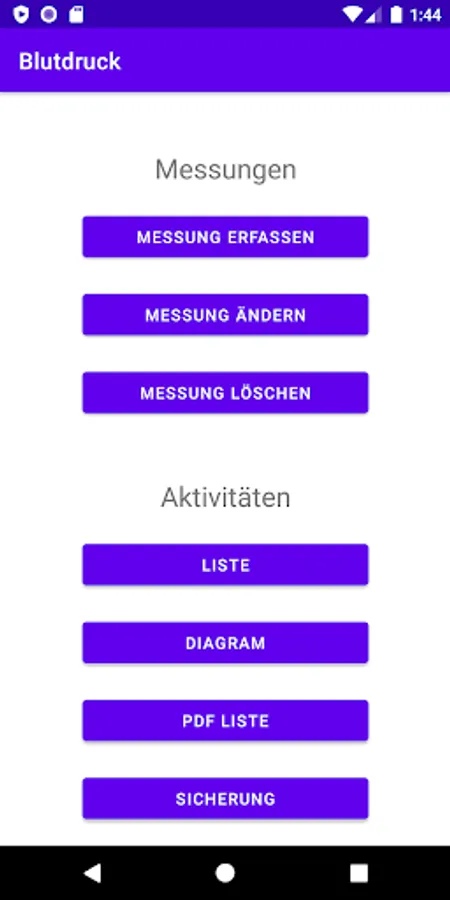 Record, change and delete blood pressure measurements. Display as a list and / or diagram. Output as a PDF list. Backup and restore of the data.